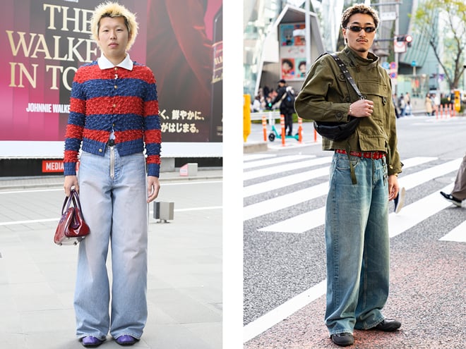 (左)ジーンズはMASUのもの。「ピンクの加工がされているデニムは珍しいし、かなり太いシルエットが気に入って購入しました」という21歳の男性(https://www.web-across.com/observe/ppce54000001seou.html)。 (右)ジーンズはZARAのもの。「太すぎるのが嫌で、ちょっと細めだけどタイトじゃないシルエットで、店舗で着てみていいなと思ったので買いました」という22歳の男性(https://www.web-across.com/observe/ppce54000001sfma.html)