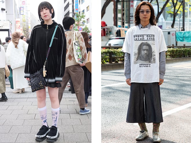 (左)ソックスはyushokobayashiのもの。「無地のソックスとかだったら無難になっちゃうけどこれならアクセントになる」という26歳の女性(https://www.web-across.com/observe/ppce54000001sgvo.html)。(右)「Gardenの店員さんを見てレッグウォーマーを買いました」という23歳の男性(https://www.web-across.com/observe/ppce54000001sga6.html)。