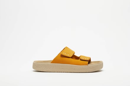 エトナは、ブランドのルーツであるブラジルへのオマージュを込めた、ブランド初のサンダル。アッパーには撥水オイルを施したサステナブルなブラジル産スエードを用いて、ベルクロ仕様のダブルストラップにデザインした。また、ソールには軽量でグリップ力の高いアマゾン産ゴムを使用したほか、内側にはサトウキビ由来のプラスチックであるE.V.A.インソールを採用。気候変動による世界的な猛暑の中で、スニーカーに替わる選択肢として、軽量で通気性に優れた一足に仕上げた。