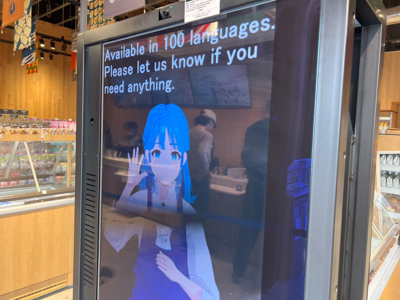 まず目を引いたのは、コンビニエンスストアのローソンで導入されていた多言語対応アバター接客。日本語や英語、中国語、韓国語だけでなく、アラビア語やヒンディー語など100言語以上に対応可能で、モニターに映るキャラクターが来場者の母語に合わせて切り替わります。