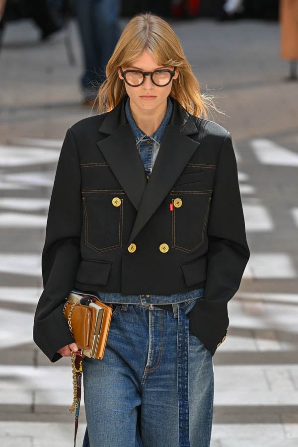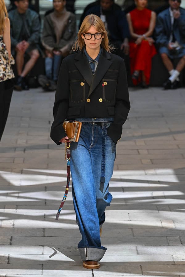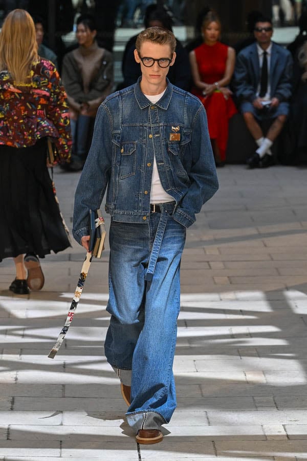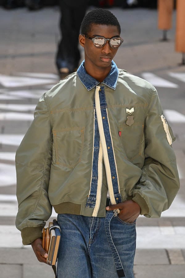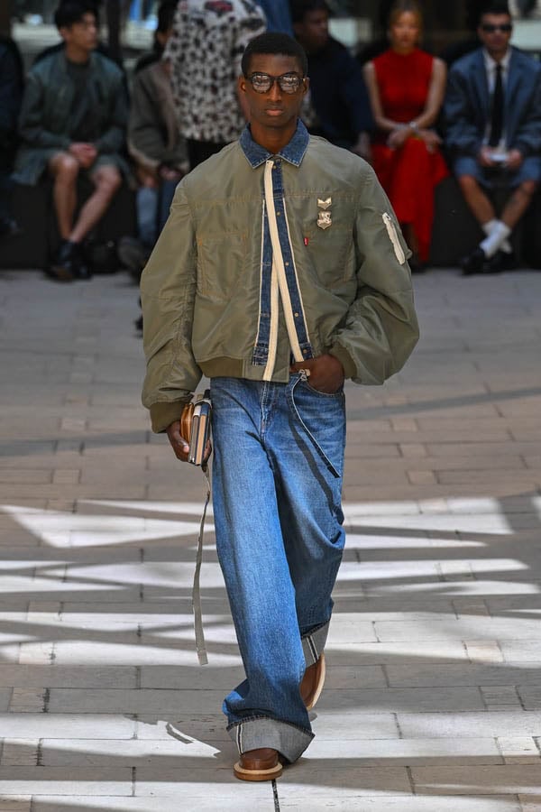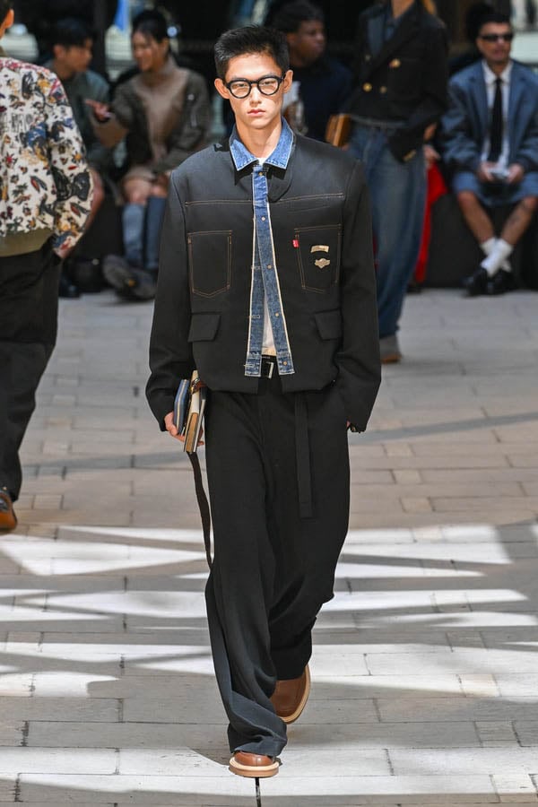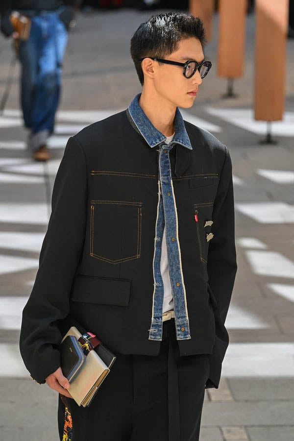 ウィメンズでは、ボクシーなAラインシルエットのジャケット(8万8000円)、サカイ独自のマテラッセツイル素材をドッキングしたデニムジャケット(12万1000円)、フレアジャンプスーツ(11万円)の計3型をラインナップ。メンズでは、通称「ファースト」「セカンド」「サード」と呼ばれるリーバイス歴代のデニムジャケット3モデルを1着にドッキングしたかのようなデニムジャケット(8万8000円)、テーラード仕様の表面とトラッカージャケット仕様の裏面を組み合わせたリバーシブルジャケット(14万3000円)、ナイロンとデニムを組み合わせたリバーシブルブルゾン(12万1000円)の計3型を揃える。ユニセックスでは、ウルトラワイドのバギージーンズ(4万9500円)が登場。デニムとグログラン生地のリバーシブルベルトが付属する。