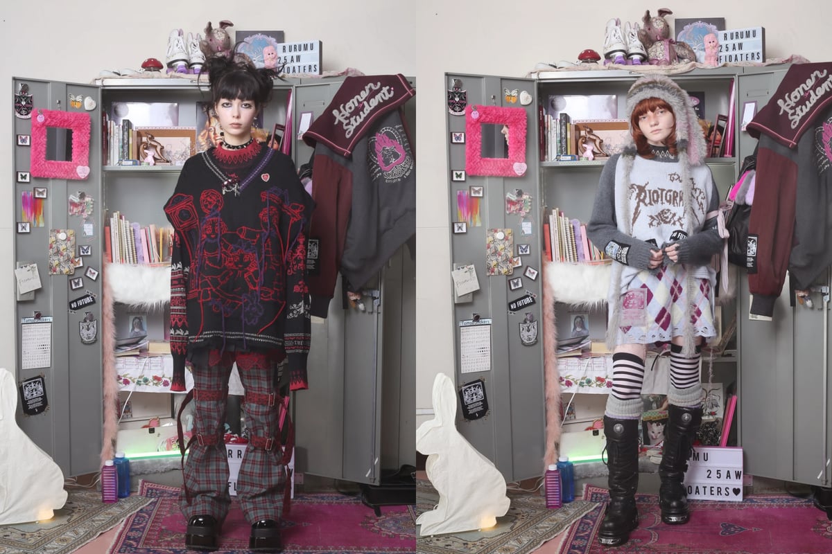 ルルムウの2025年秋冬コレクションのテーマは「FLOATERS(フローターズ)」。アメリカの学校文化を表す際、特定のグループに所属しない「不思議ちゃん」を意味するスラングで、「周りを気にせず、自分の好きを突き詰めて欲しい」という想いが込められている。コレクションは、アメリカの学校生活をリアルに描いた映画「ブレックファスト・クラブ」をインスピレーション源に、プリーツスカートやヴァーシティジャケット、ダッフルコートなどスクールガール風のアイテムで構成。随所にヴィンテージ加工や骸骨をイメージしたウサギのプリントを施すことで、学生時代特有の鬱屈した感情や葛藤を表現したという。