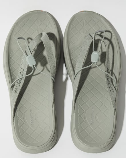 別注モデルはリグのトングサンダル「プワニ(PWANI)」をベースに採用し、甲部分にドローコードを配してフィット感を向上。ノンネイティブ2025年春夏コレクションのテーマカラーに合わせてカーキとブラックの2色を揃え、トングにはナチュラルスウェードを用いた。サイズは23〜30cmで展開し、価格は各1万8800円。