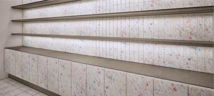 店舗の設計は、シロの店舗を多数手掛けるDRAWERSの小倉寛之氏が担当。リサイクルが難しい雑多衣類と再生ポリエステルを圧縮した「再生フェルト」に着目した。什器や壁面を覆うようにフェルトをあしらったほか、出入口にはシロのロゴを配したフェルトをタイルのようにレイアウト。今後は、再生フェルトに香りをまとわせた製品の開発も検討しているという。