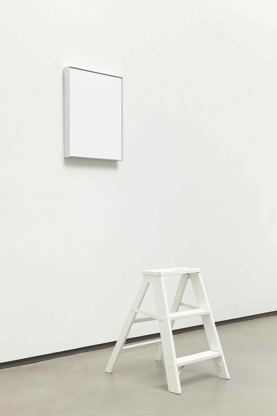 Fly Piece, 1963/1998, Canvas, aluminum frame, ink, ladder, white acrylic paint, sterling silver plaque, h.61.0 x w.45.0 x d.57.0 cm (ladder) / h.51.0 x w.41.0 x©Yoko Ono, Courtesy of Tomio Koyama Gallery