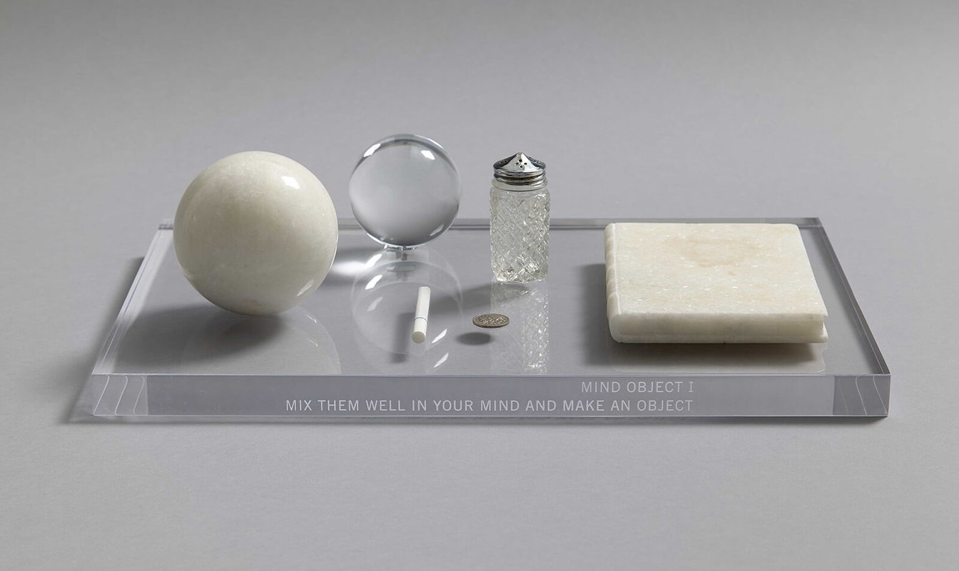 Mind Object I, 1960 /1966, Acrylic, marble, coin, cigarette, salt shaker, h.2.5 x w.45.5 x d.30.0 cm©Yoko Ono, Courtesy of Tomio Koyama Gallery