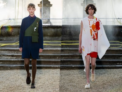 6月17日から20日までの期間行われているメンズ見本市「第108回ピッティ・イマージネ・ウオモ(Pitti Immagine Uomo)」で、ゲストデザイナーに選出されたニコロ・パスカレッティは、イタリアにあるフィレンツェ市立劇場の屋外でショーを開催。2026年春夏メンズコレクションは「懐古に浸らず過去をレイヤーし未来へ意味を築く」という宣言のもと、軍服、クラシックワーク、スポーツウエア、テーラリングという相反する要素を織り交ぜた。ドレープとギャザーで柔らかく落としたケープや、脛部分でスリットが開き動きに合わせて揺れるトラウザーズ、スカートのように広がるショーツ、プリーツスカートをジップで装着できるパンツなどを披露したほか、肩からずれ落ち、胴はねじられ、腰にかけて垂れ下がるデザインで既視感のないフォルムを追求。また、モジュラー式ジュエリーでルック全体にアクセントを加えた。