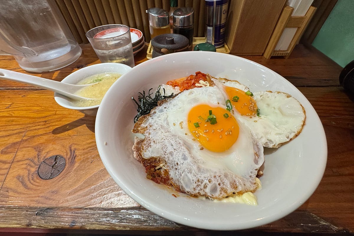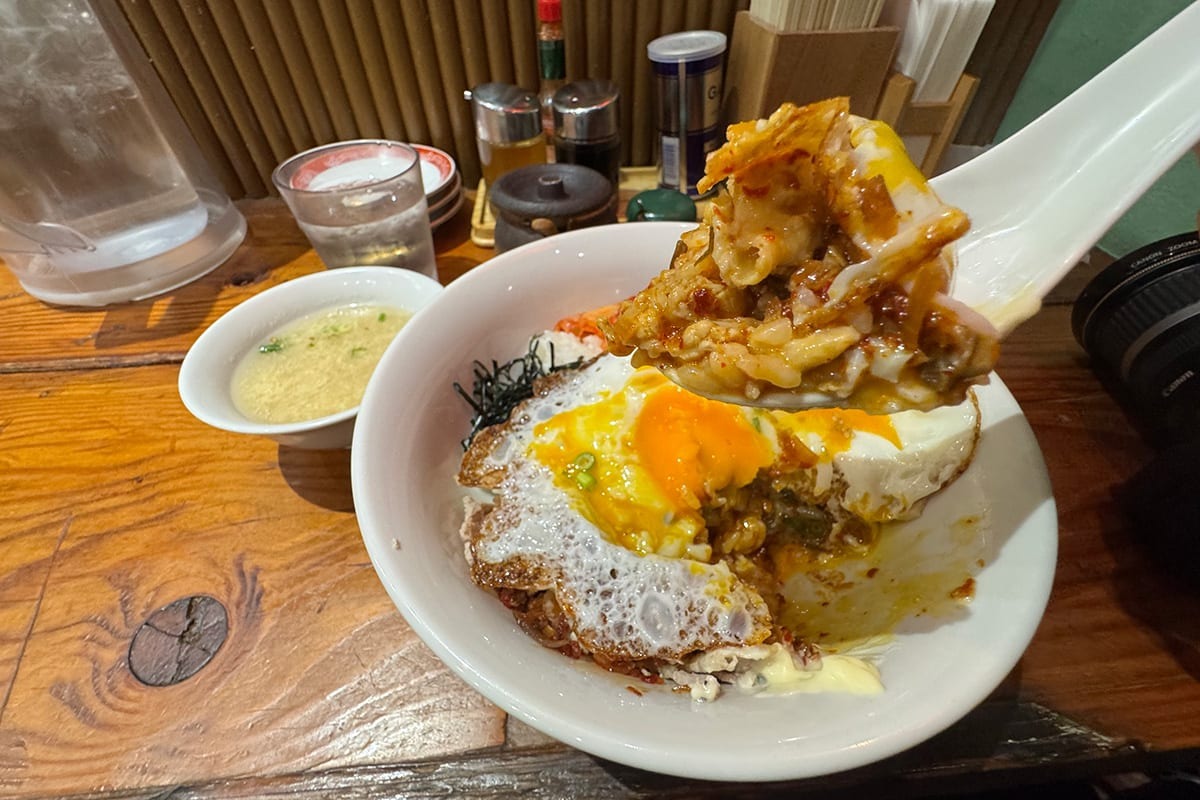 オーダーから10分ほどで着丼。ラーメン丼にご飯がガバッと多めによそられ、2つの目玉焼きに覆われたそれが目の前にやってきた。何度も食べているが、正味なんなのか、正確にはわかっていない。ただ、これがめちゃくちゃうまいということは断言できる。