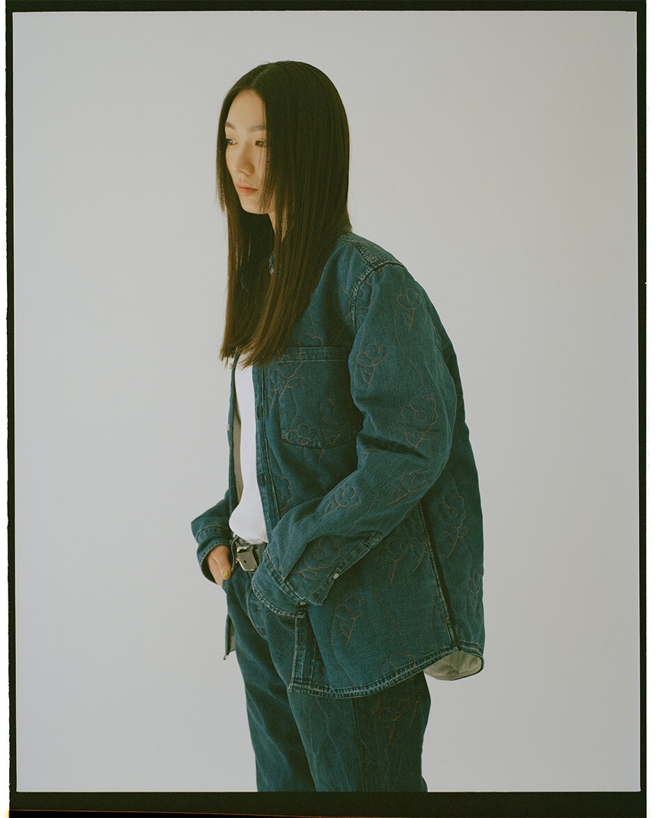 キルティング素材とヴィンテージ素材を融合させたアイテムには繊細な花柄刺繍があしらわれ、着用者の中の芯の強さとしなやかさを美しく引き立てる。