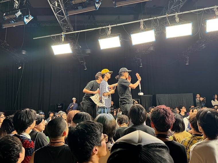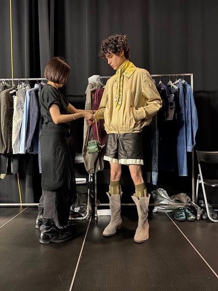 「MASU」は東京・新木場の撮影スタジオで、ファンを迎えたイベント「シークレットボックス」を開催した。「26年春夏コレクションの撮影現場を、マスボーイズのみんなに見てもらいたい」と、デザイナーの後藤愼平自らがインスタグラムで呼びかけ、若者が500人以上が集まった。報道陣はわずか。あくまでも若いファンに向けて、普段は見ることができない撮影の過程を披露した。