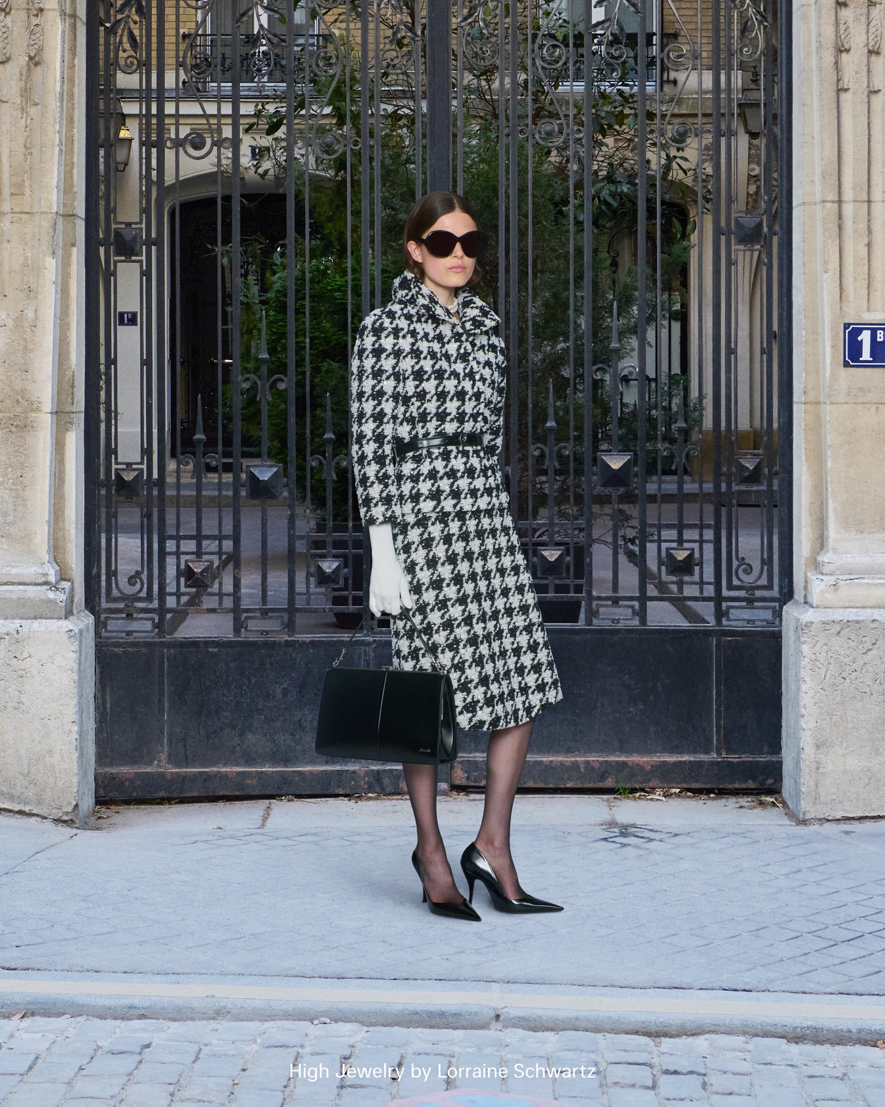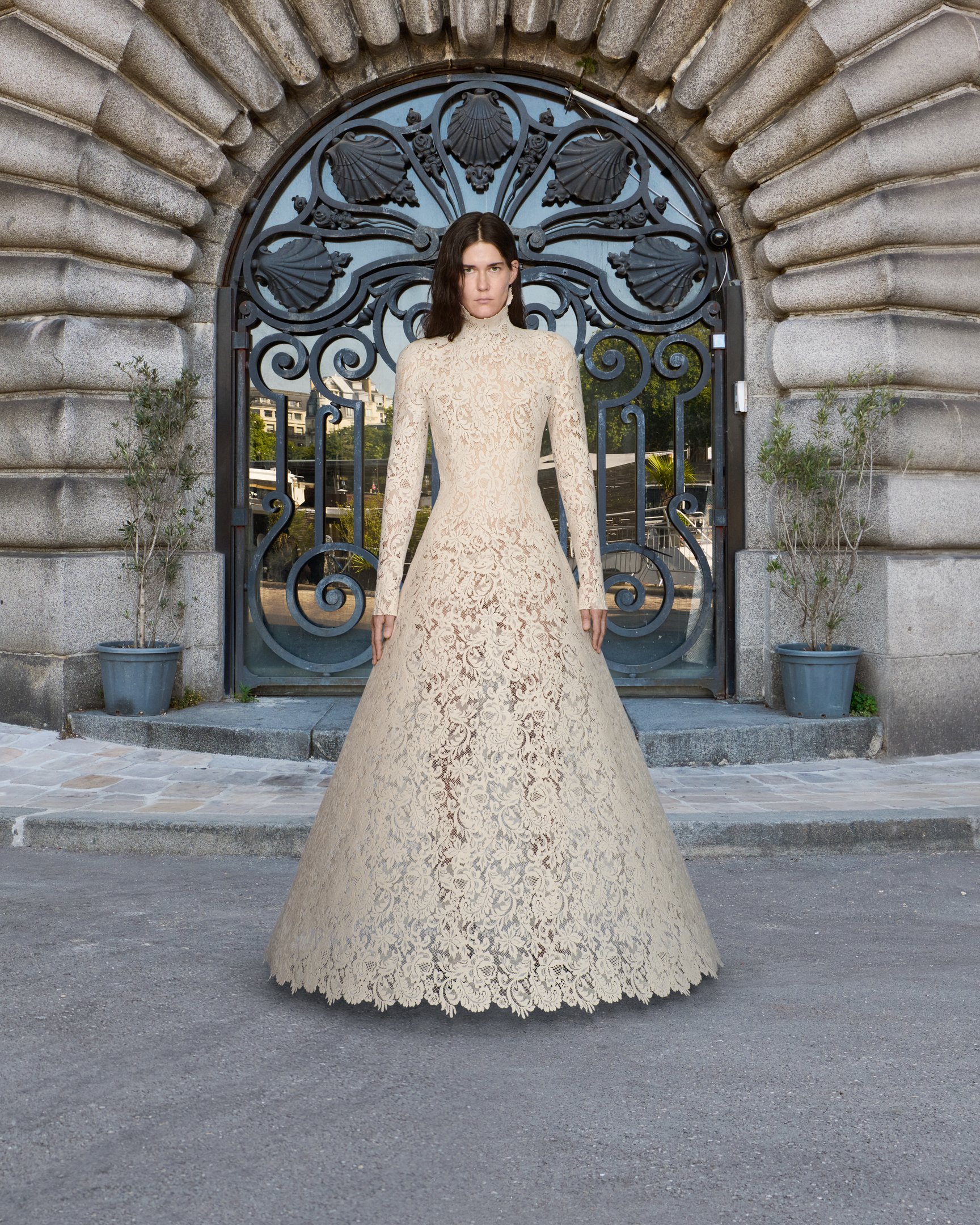 創業者のクリストバル・バレンシアガ(Cristóbal Balenciaga)のデザインや設計思想も随所で引用。「Danielle スーツ」では1967年のハウンドトゥースのアンサンブルを再現し、帽子制作の技術で成形した縫い目のないギュピュールレースのガウンは、メゾンの美学を体現するルックとしてフィナーレを飾った。