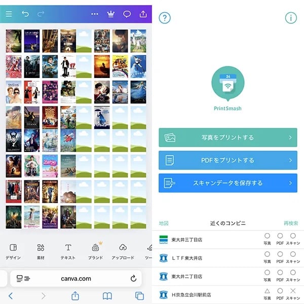Canvaの場合はPDFで保存し、PrintSmashというアプリで「PDFをプリントする」を選択すると、コンビニ印刷できますよ(写真右)。
