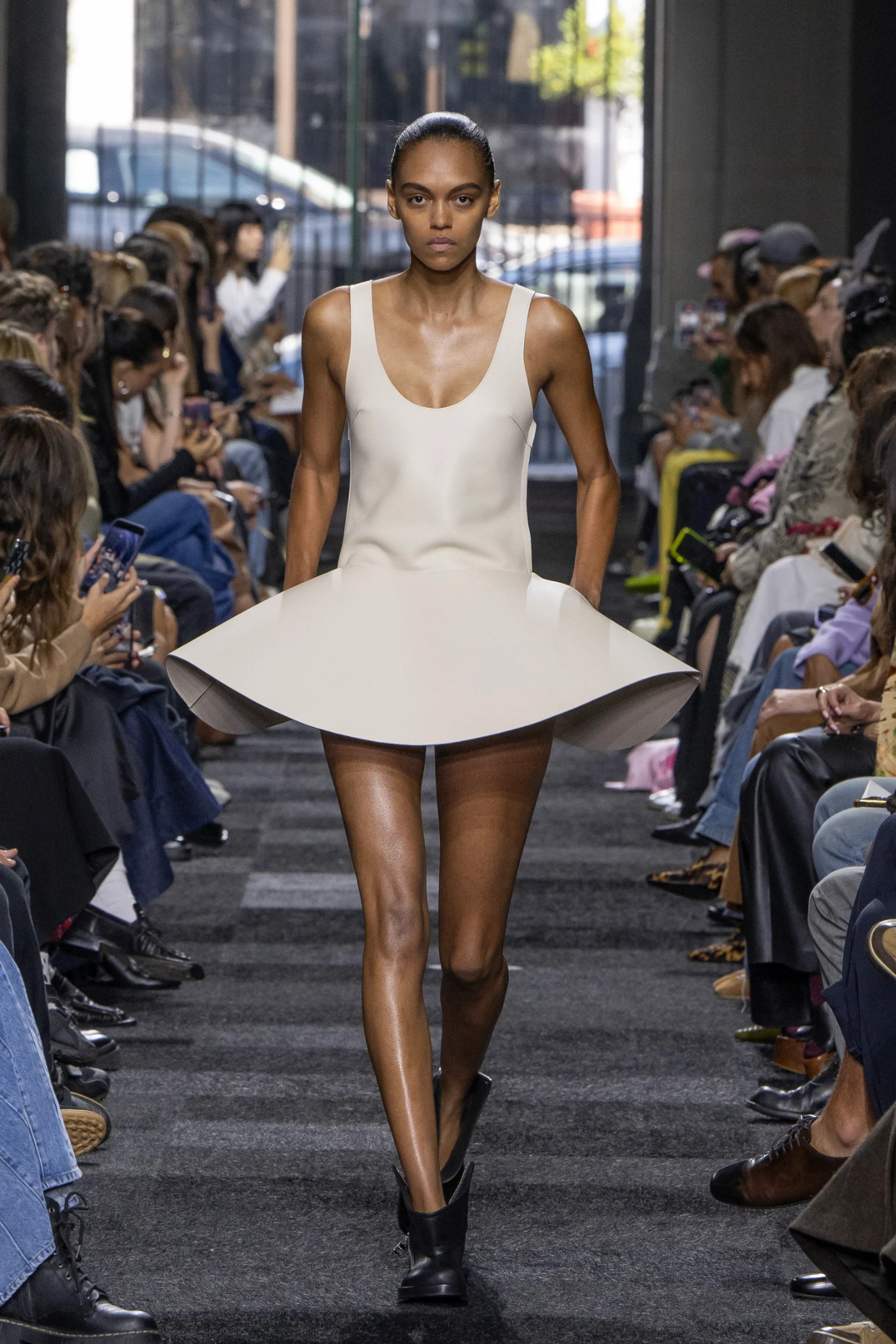 一方、同じシーズンのウィメンズコレクションは、ノースリーブのワンピースやスカートなど、女性の服の基本アイテムを軸に発表していく。巨大なフレアシルエットのスカート、巨大な短冊状の身頃、巨大なリボンと、メンズと同様に「誇張」が主役だった。