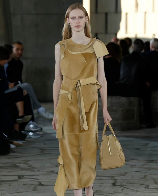 同シーズンのウィメンズコレクションでは、細くて長いシルエットのドレスが多い。通常ならリュクスに感じられるシルエットだが、ロエベのそれは高級感と無縁。裁断したスエードを繋ぎ合わせただけのドレス、切りっぱなし、立体的に作り込まないトップスやドレスなど、プリミティブなデザインが顕著だった。
