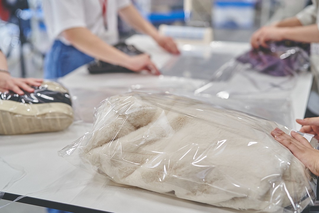 シワやほこりひとつで商品画像のクオリティが大きく異なるため、商品はすべて1点ずつスチームアイロンで丁寧に仕上げるのがピックユーのこだわり。