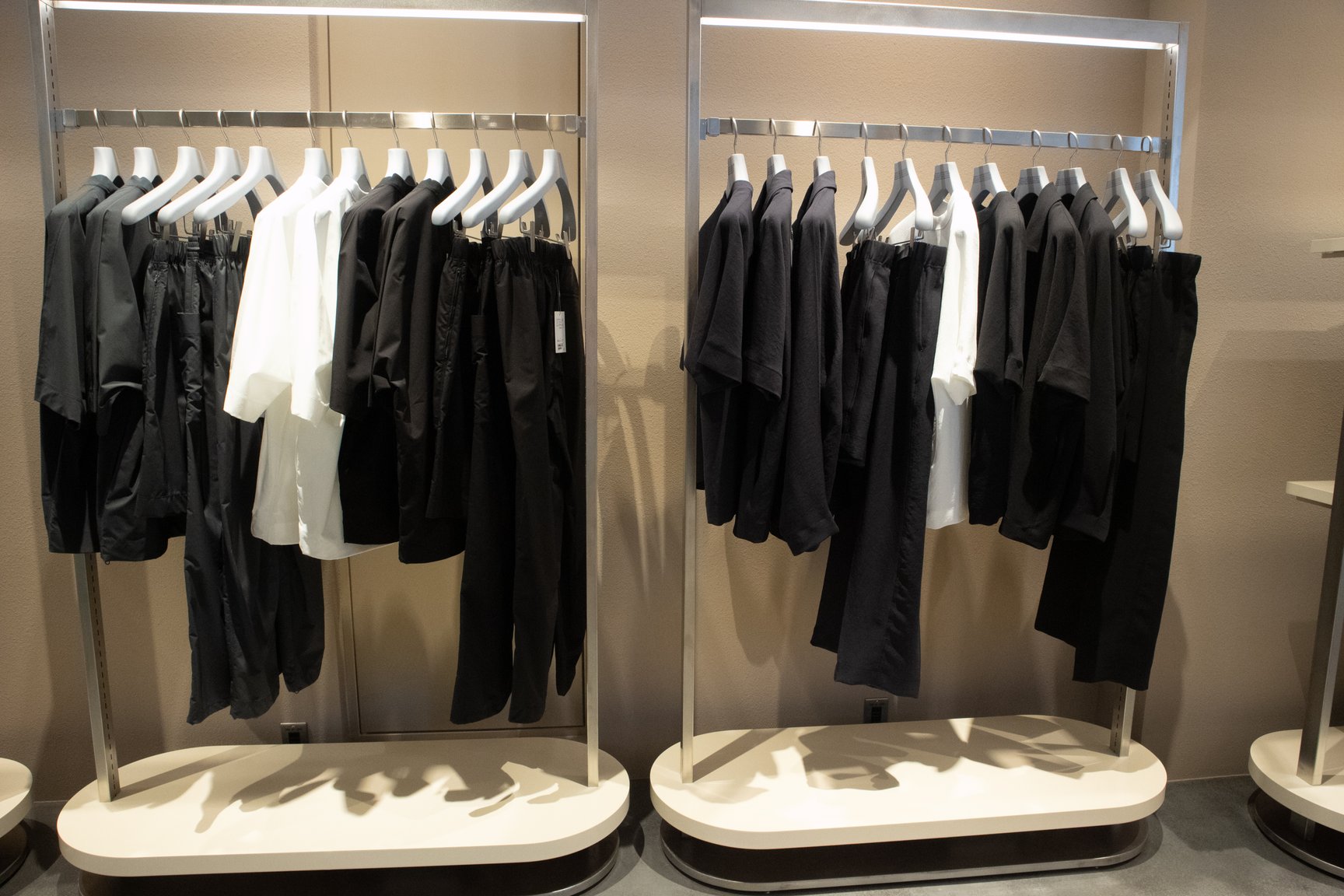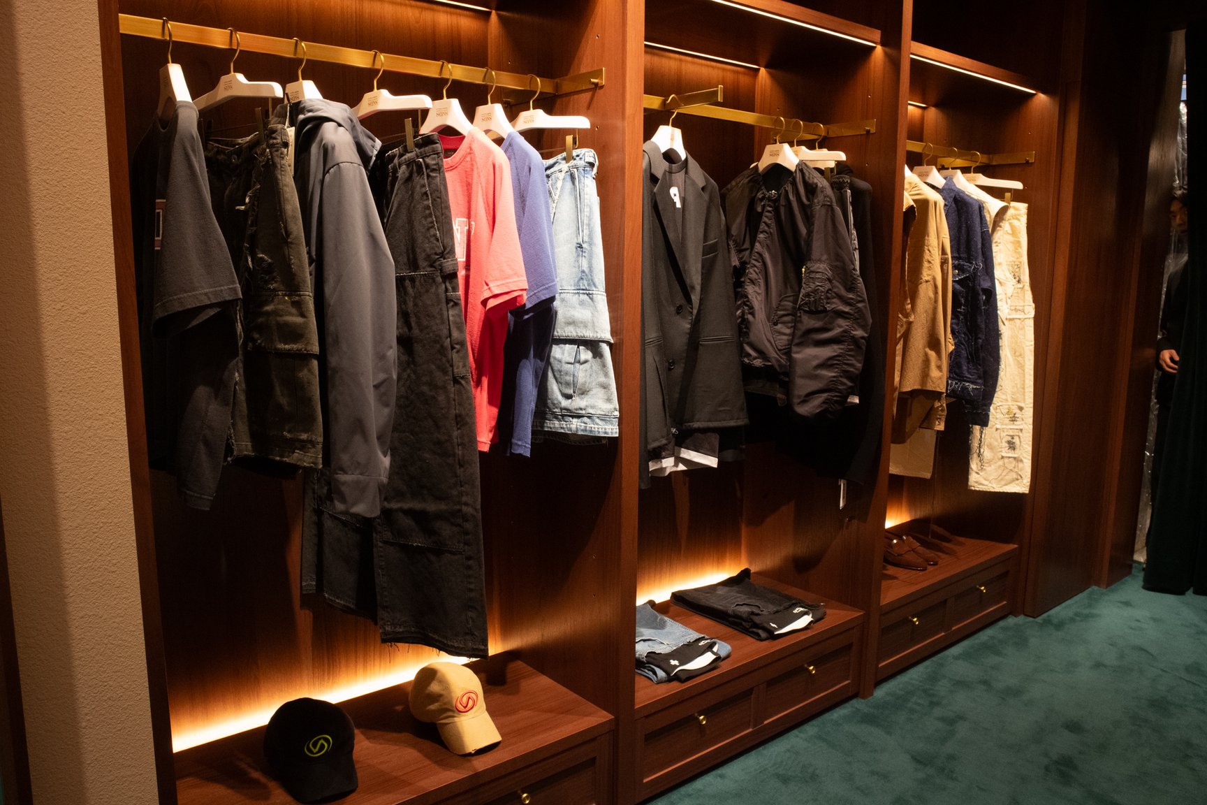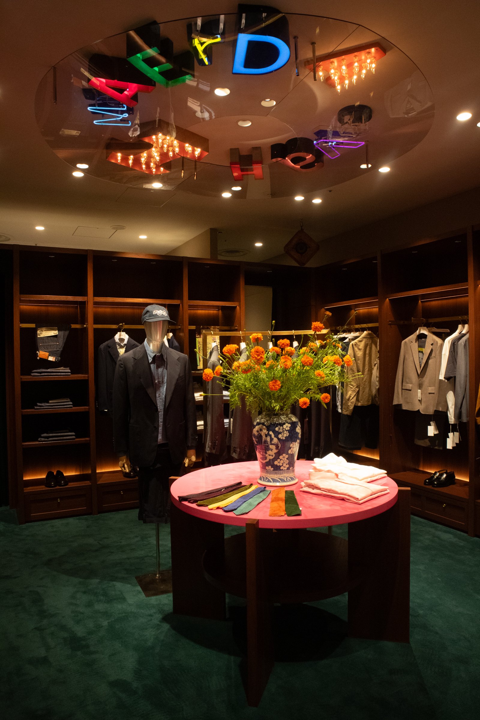 その思いを体現するように、店舗のデザインを一新。約145平方メートルの広々とした店内に、モダンな印象のエントランスとテーラーのような重厚なフロアが同居する。白を基調とするギャラリー然とした旧店舗とは趣向を変え、寛いでゆったりと買い物を楽しめる「服屋らしい雰囲気」を目指した。一方で、一部の照明やアート作品などは原宿時代から引き継ぎ、旧店舗時代からのファンが懐かしく感じられる空間に仕上げている。