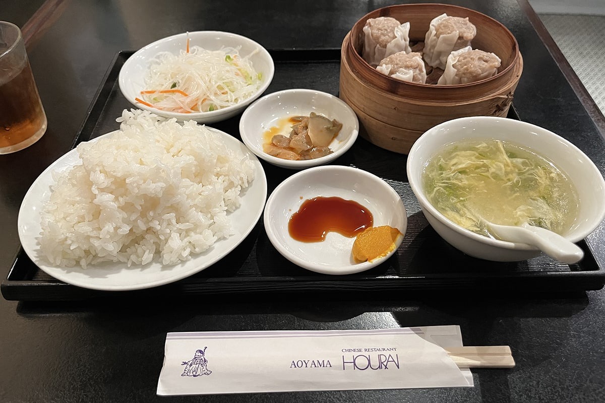 青山(神宮前5丁目)の老舗中華料理店・蓬莱。日替わりのランチはメインにライス、スープ、サラダ、 お新香が付いてお腹いっぱい食べられる。おすすめは肉しゅうまいランチ。これがマジでおいしい。ふっくらふわっと、お肉がたっぷりのしゅうまいに、ご飯をかきこむ手が止まらなくなる。店の顔であり町の顔、2代目の名物店主・仲田さんからも元気がもらえる、筆者も大好きな町中華店だ。