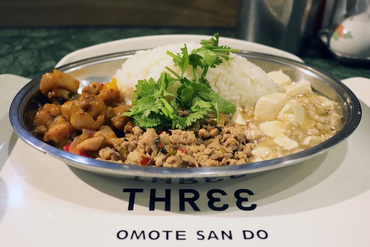 “町”というより“街”が似合う立地。けれど紛れもなく町中華なブルー・ザ・スリー。気さくでおしゃれな近所の兄(あん)ちゃんと言った感じ。そんな風情の町中華のランチはエスニックミックスのワンプレートスタイル。全6種から3品選べる中華×クロスカルチャーな感性がふんだんに盛り込まれたおかずの数々が魅力的すぎる。日替わりなので職場や自宅が近ければ、思わず「今日は何があるかな?」と毎日メニューを覗きに行ってしまいそうだ。
