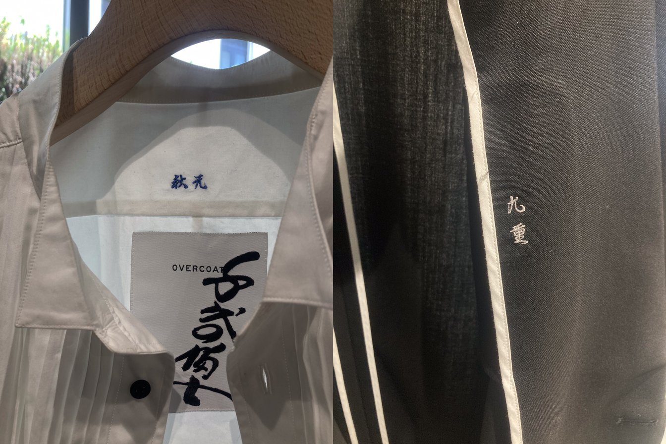 左:シャツの襟裏に配した本名の刺繍 / 右:ジャケットの見返しに配した部屋名の刺繍