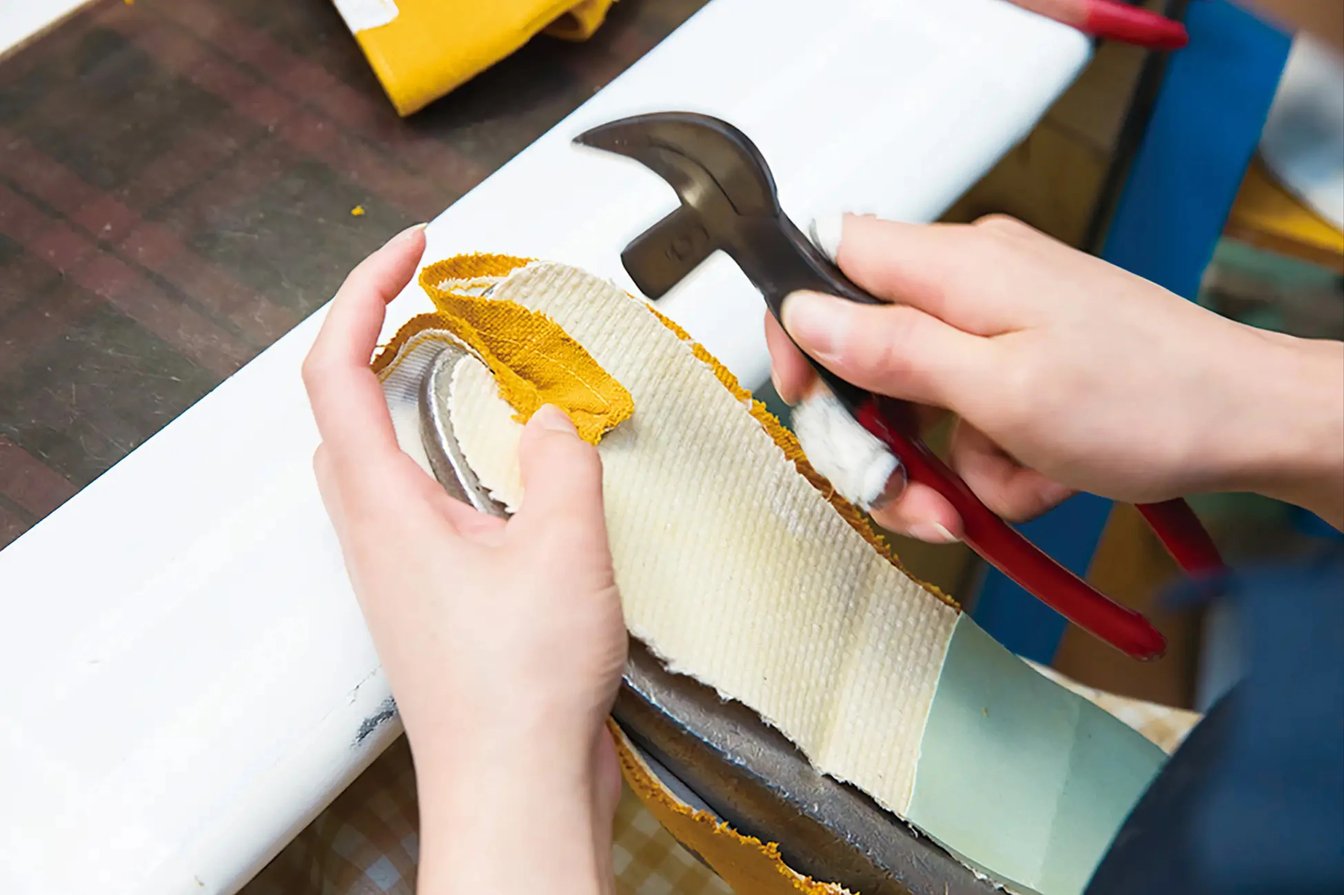 インソールには綿100%の刺し子を使用しており、素足で履いても心地よい。生産は岡山県倉敷市の自社工場で行われ、熟練の職人による繊細な技術によって一足ずつ時間をかけて作られている。