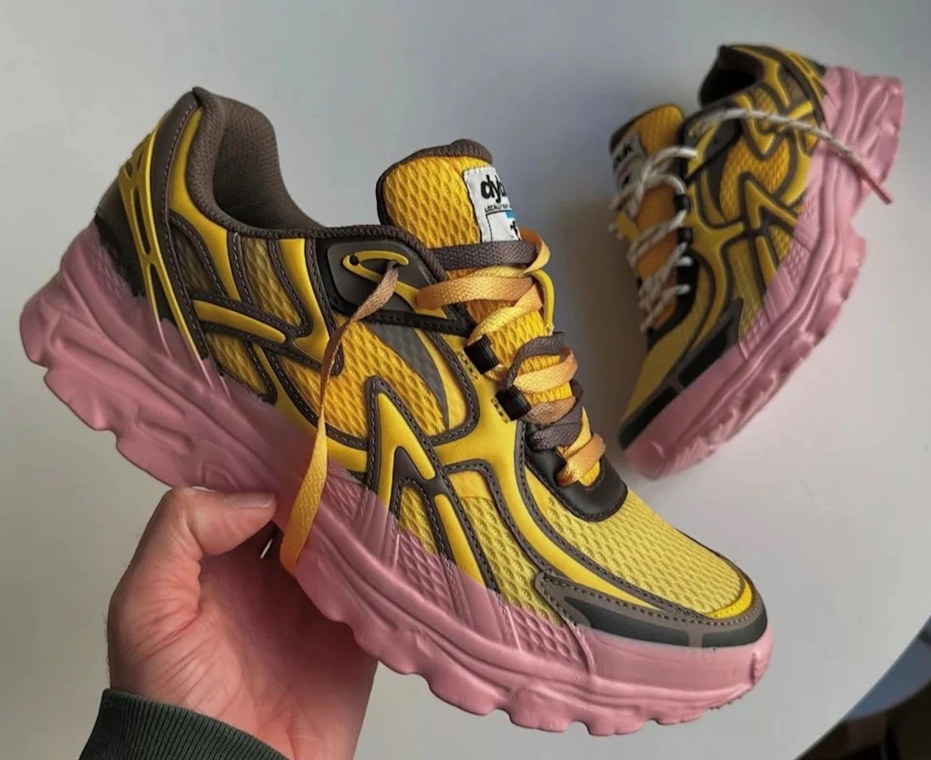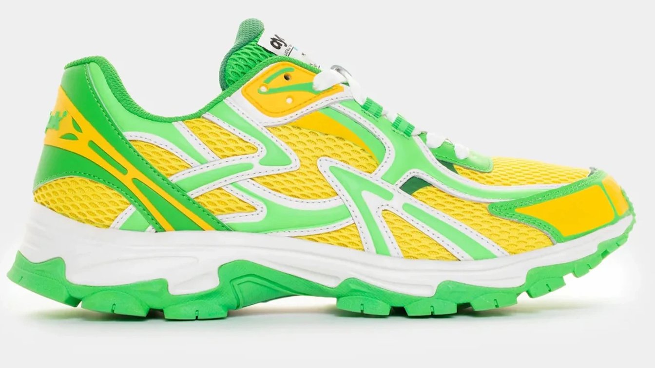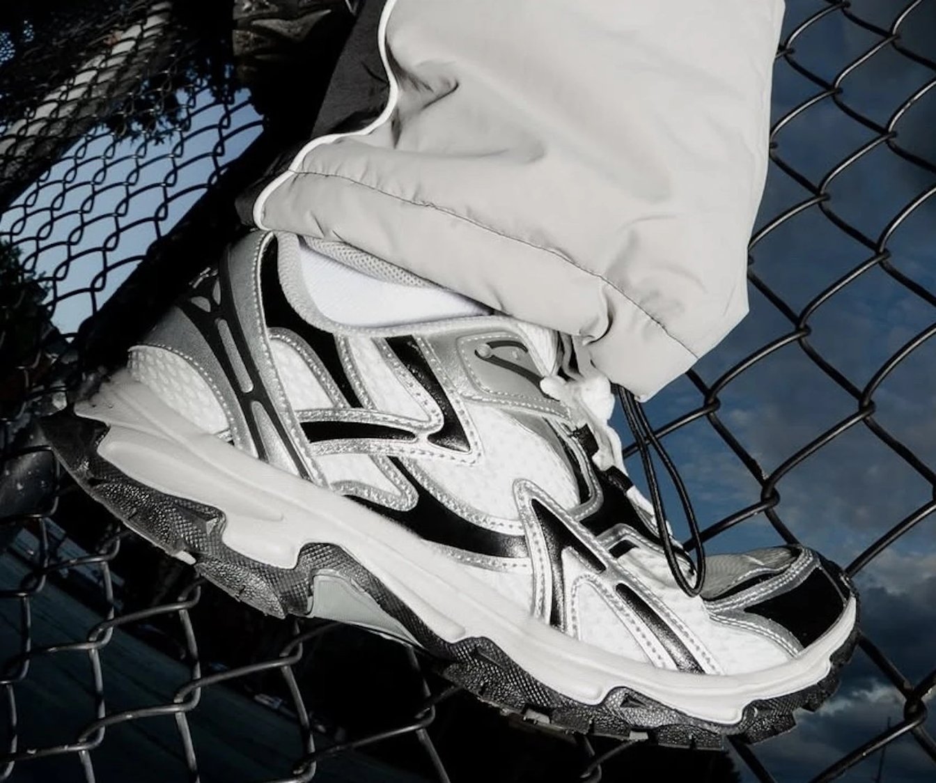 特徴は、複雑に重なり合うパーツと大胆な切り替えが織りなす立体的な構造である。見る角度によって表情が変わり、直線と曲線が混在するアッパーが足元に存在感を与える。