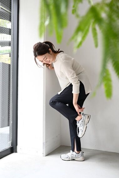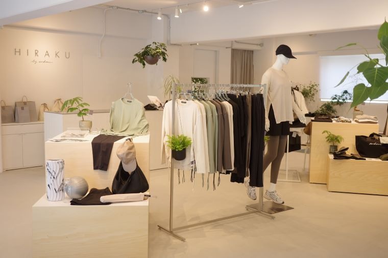 ブランド名のヒラクは、肩を開くという動作に加え、心や新しい扉を開くという精神的なメッセージも込めた。ウェア5型から始め、運動不足の体でも美しく見えるデザインにこだわった。例えば、サイドにスリットが入ったニットトップ(税込み9790円)は、サイドを結ぶとアシンメトリーになり、すっきりとしたシルエットに見せる。水陸両用のショートパンツは、スポーティーになりすぎないように裾のスリットに丸みをつけた。