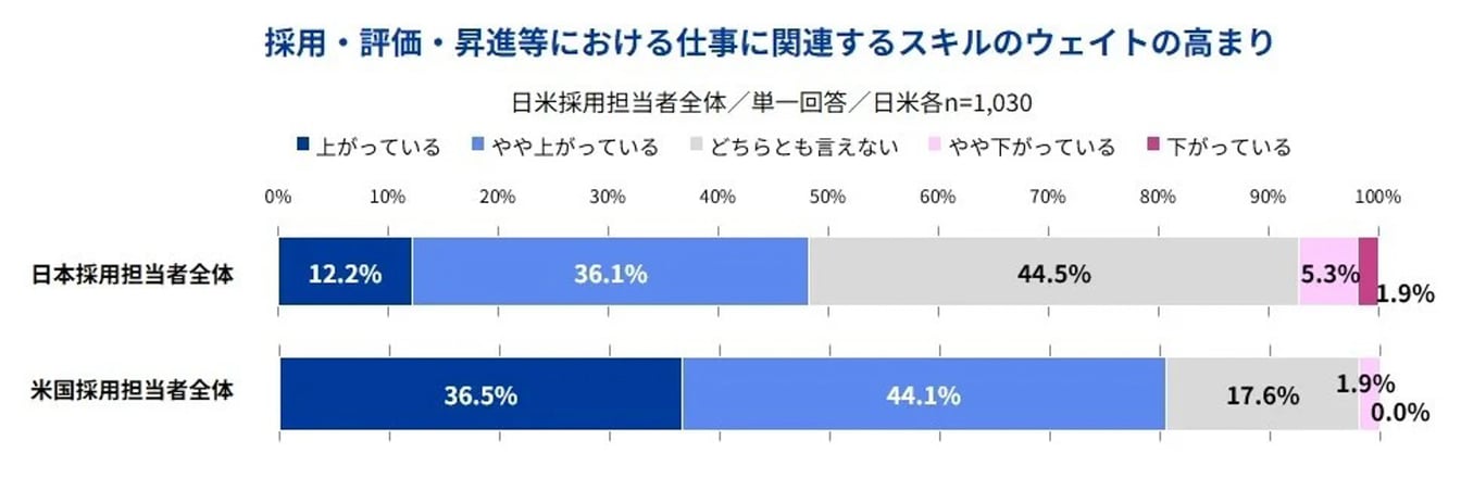質問:「(日米企業の採用担当者へ)近年、採用・評価・昇進等の基準において『仕事に関連するスキル』のウェイトが上がっているか」