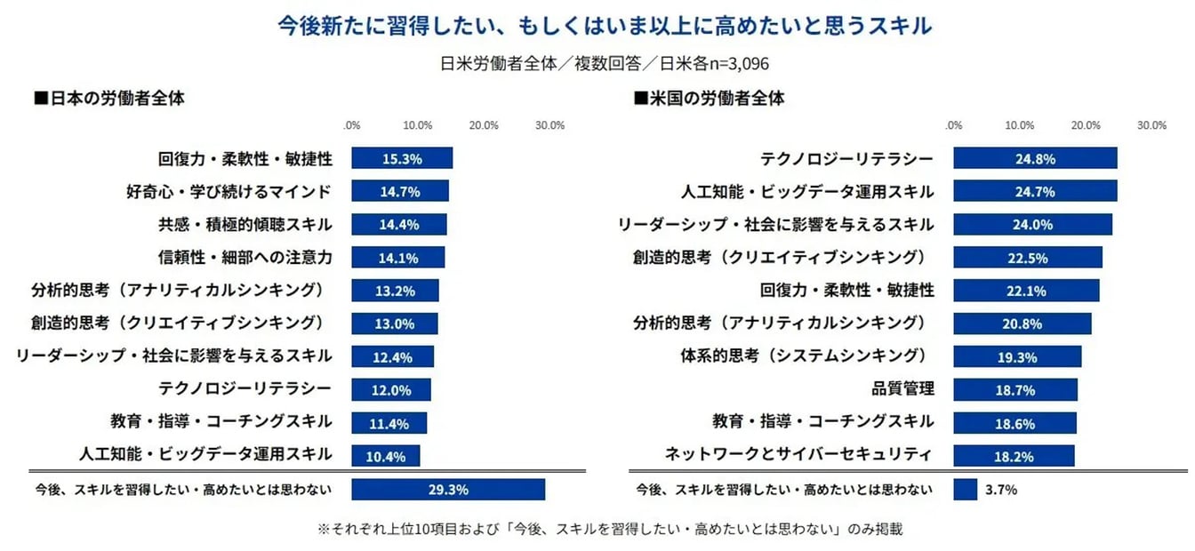 ・「今後、スキルを習得したい・高めたいとは思わない」と回答……日本では約3割が(29.3%、最多回答)、米国ではわずか3.7%。
