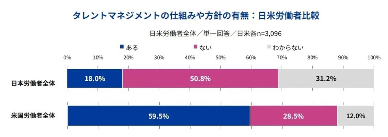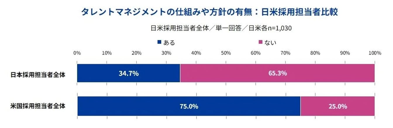 従業員のスキル習得について、日本は「従業員に委ねる」あるいは「そもそも方針がない」企業が多く、米国は従業員に学習機会やコミュニケーション機会を提供している企業が多いようです。かつては離職率が低い日本企業の方が米国企業より人的資本投資意欲が高いと言われた時代もありましたが、今は完全に逆転しています。生成AIを中心とした新技術やその用途の急激な進化でビジネスモデルや業務内容が大きく変わりつつある中、米国では外部労働市場で必要な人材を十分に獲得できなくなっている一方、日本ではまだ変化がさほど顕在化していないと言えるでしょう。それは、「タレントマネジメント」の導入状況の日米差にも現れています。トレーニング機会の提供は人材獲得にも寄与します。日本企業も人材獲得難から、こうした外部労働市場の変化への対応を求められるようになるでしょう。