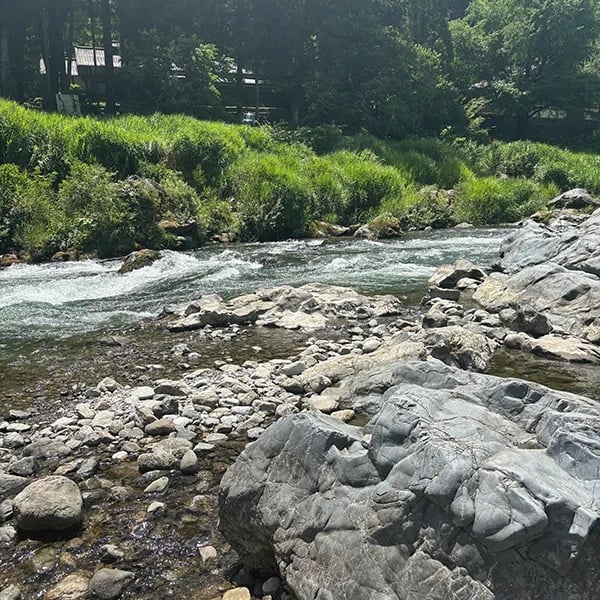 川は比較的浅めで、幅広の川原が広がっているため、ゆったりと森林浴や散策を楽しむことができますよ。