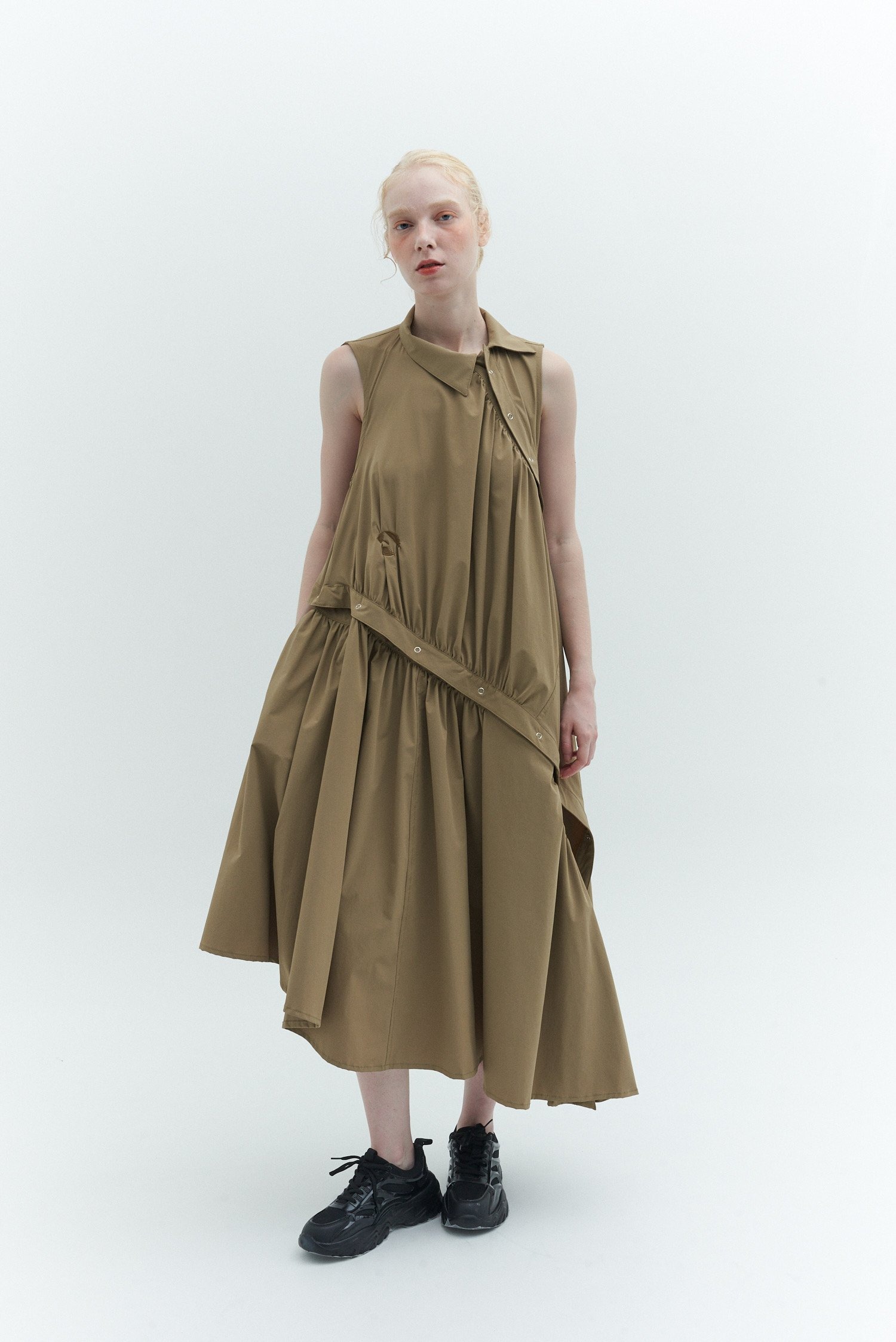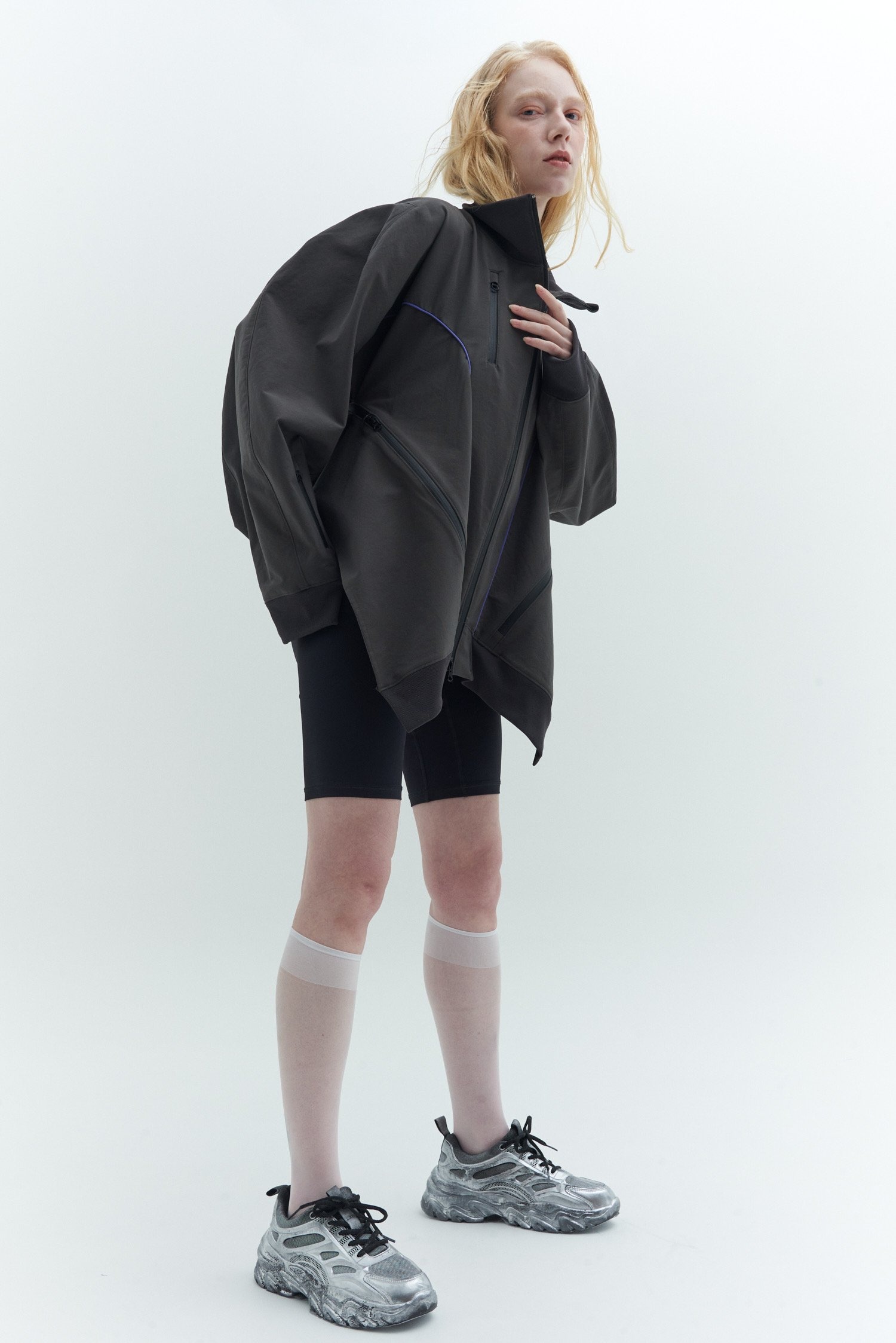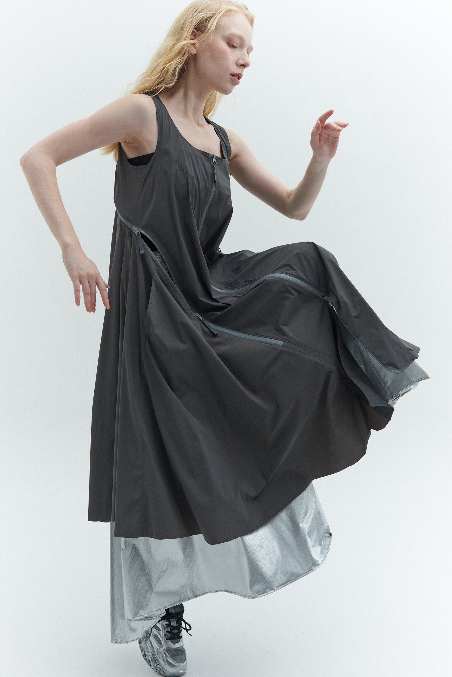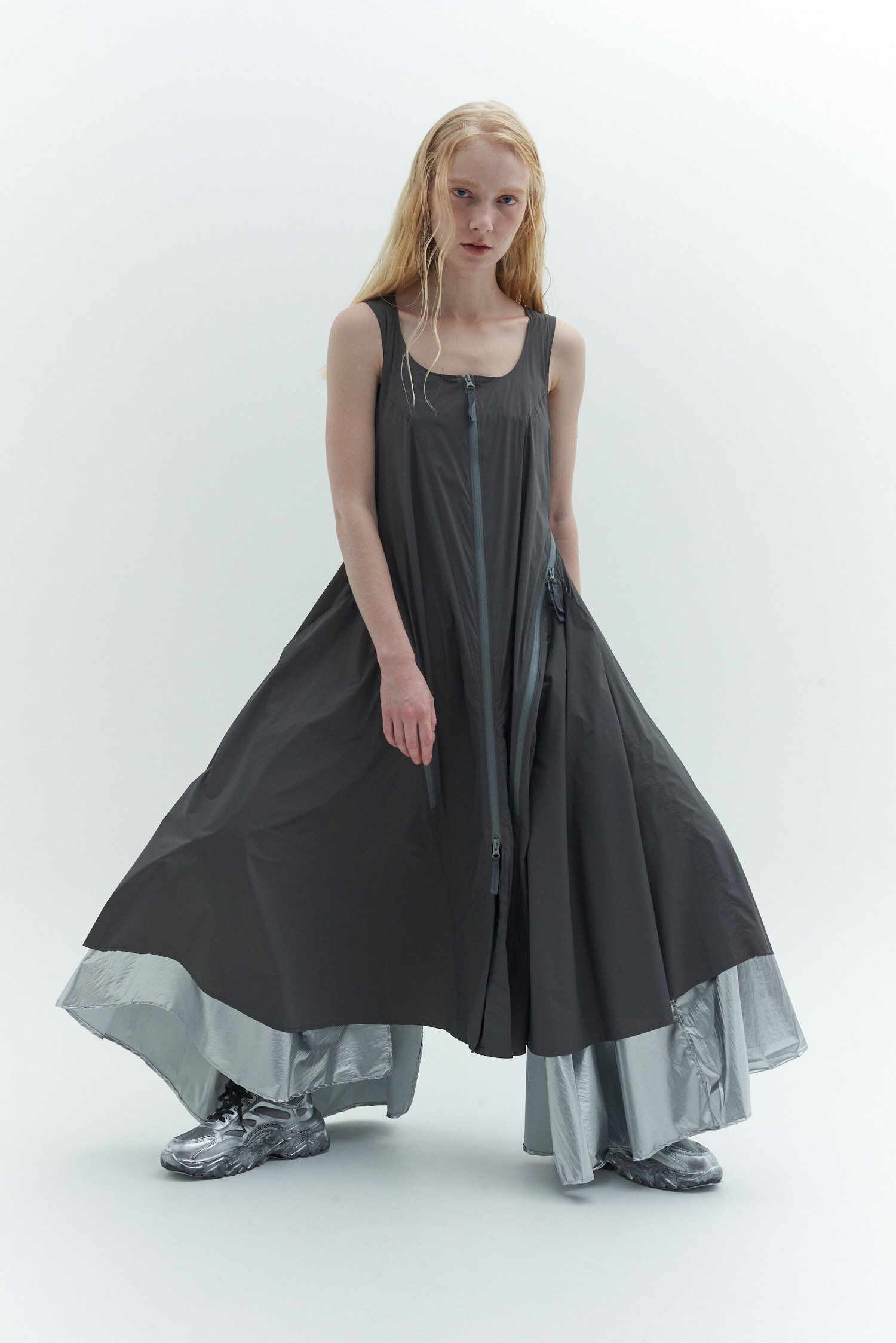 河村は「アスレチックやスポーツの要素は、素材の機能性に捉われず、行動のための必然的なディテールとして参考にしている。そうしたユーティリティは保ちながら、ファッションとして楽しめるものを作りたかった」と説明。アウターやドレスはファスナー使いによってシルエットの変化を楽しむことができ、手持ちの服とのレイヤードなども提案する。