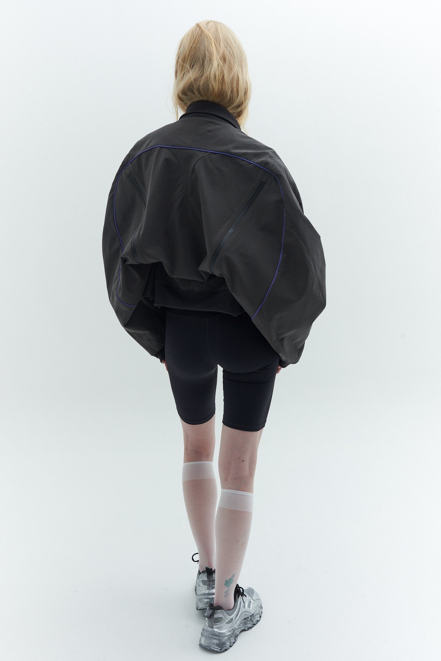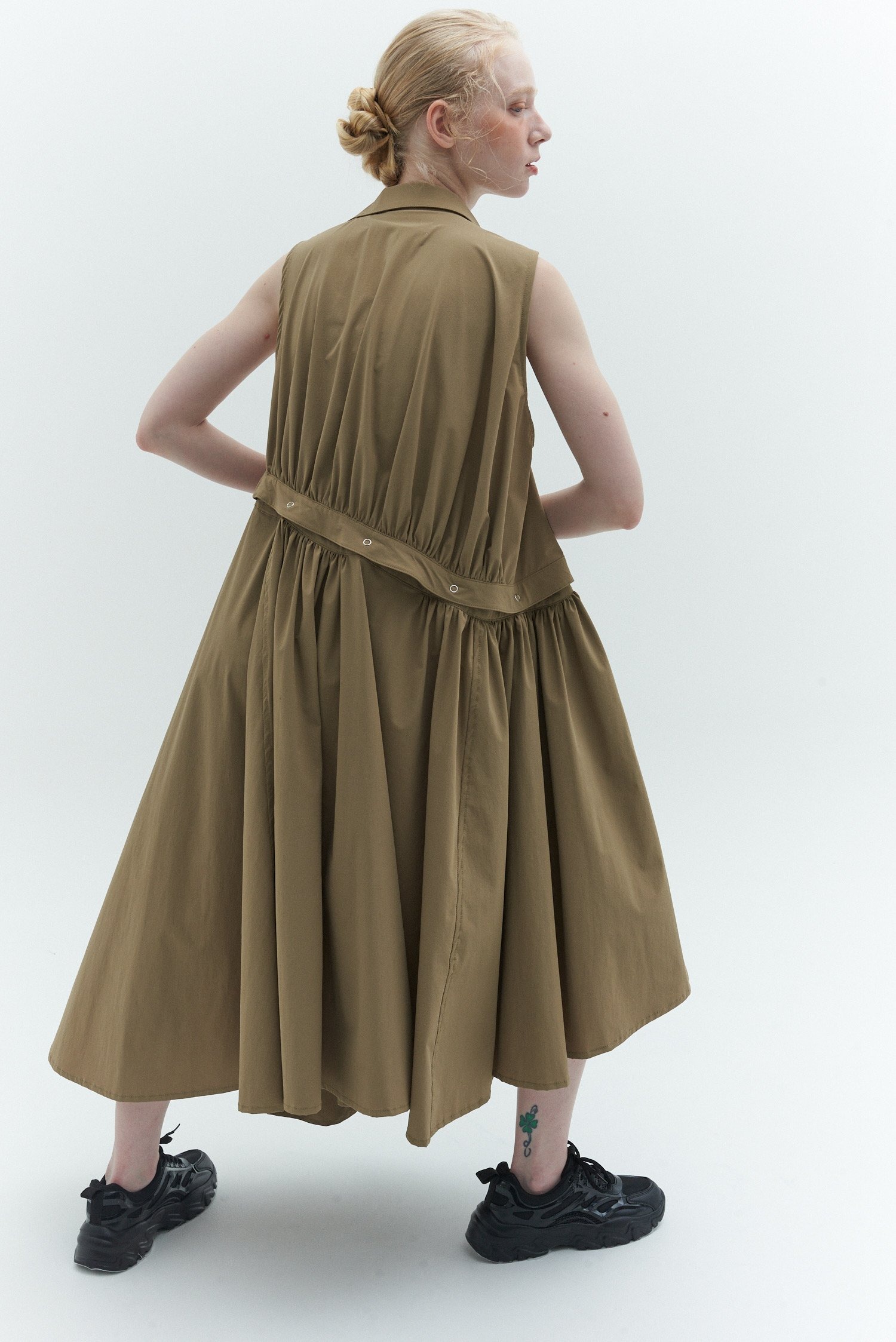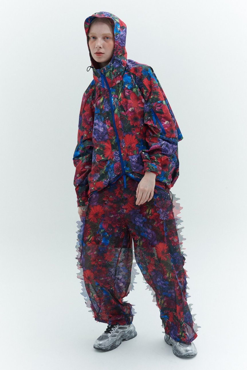 ファスナーをパターンの”延長”として取り入れたデザインが特徴で、ドレスのウエストからヒップにかけてのボリューム感や、バックスタイルのシルエットを立体的に見せ、スポーティな素材を都会的なスタイルへと昇華させている。また、観察アーティストのeve.asamiとコラボレーションし、鮮やかな花のグラフィックを随所に採用した。