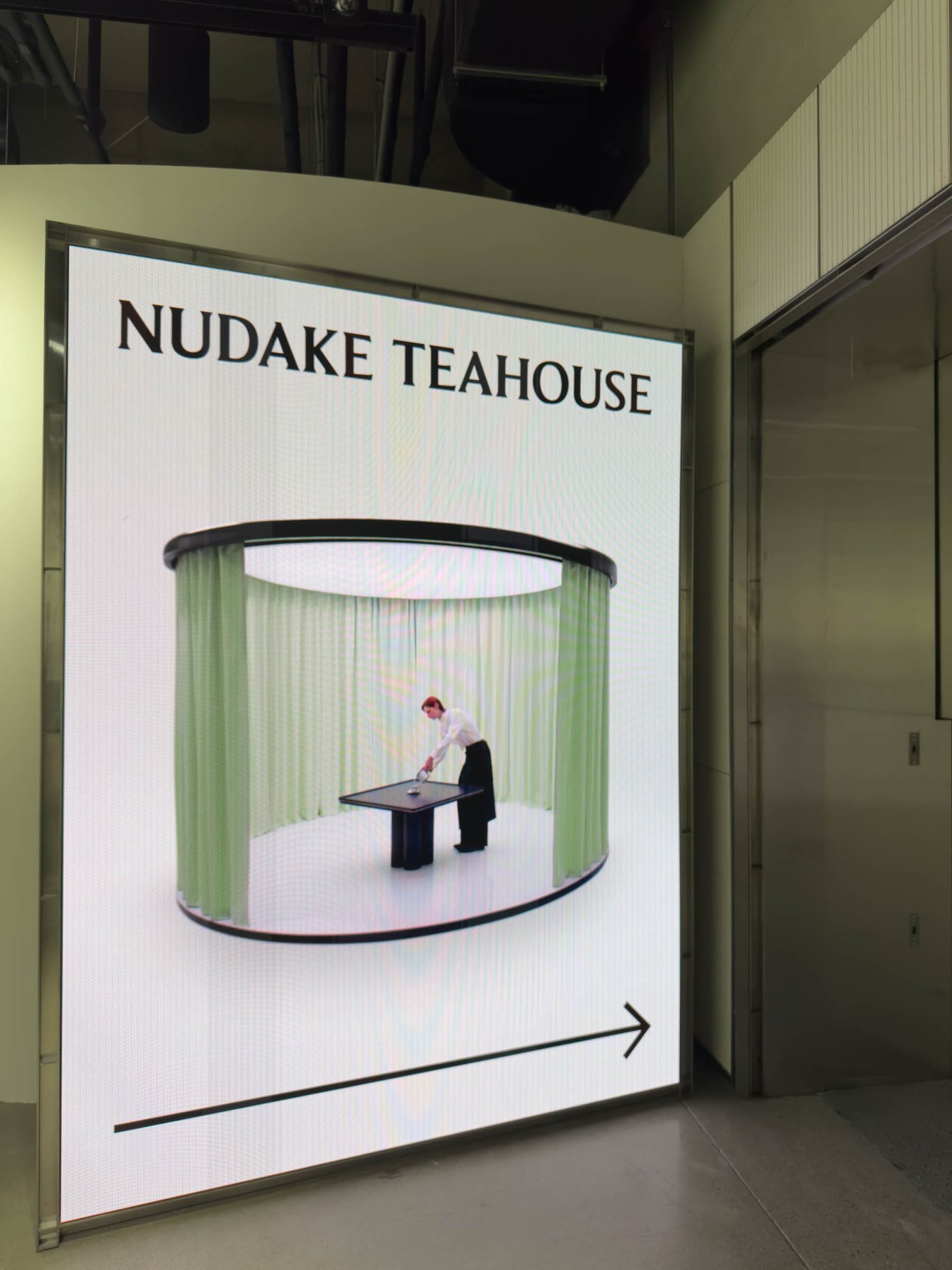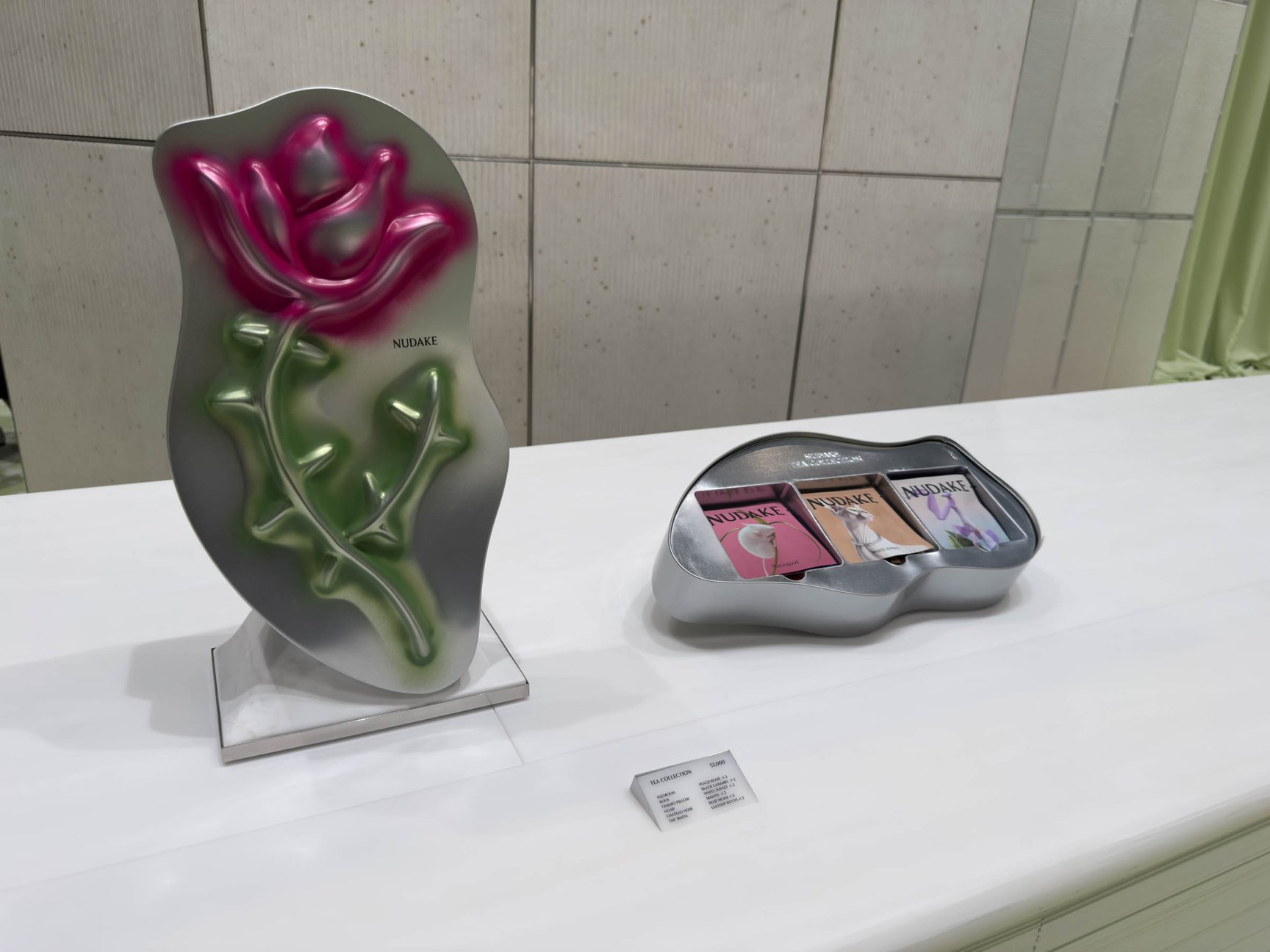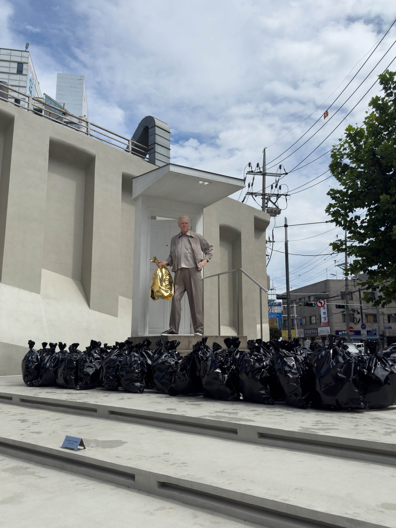 店舗の隣には、アーティストのマックス・シーデントーフ(Max Siedentopf)とのコラボレーションで制作したインスタレーション作品「More Is More」を設置。多数の黒いビニール袋が膨らんではしぼむことで巨大な波のようにゆらめき、空間全体が呼吸をしているかのような印象を与える。中央に置かれた老人の像は、生き生きとした眼差しで波の向こうを見つめ、手に握られた金の袋は、好奇心と発見、思いがけない場所で見出される美しさを象徴している。袋の中に何が入っているかは、鑑賞者の想像に委ねられ、人間が内に秘める輝きや驚き、無限の可能性を表現しているという。同作は、ドサン、上海、深圳のHAUS NOWHEREでも展示される。