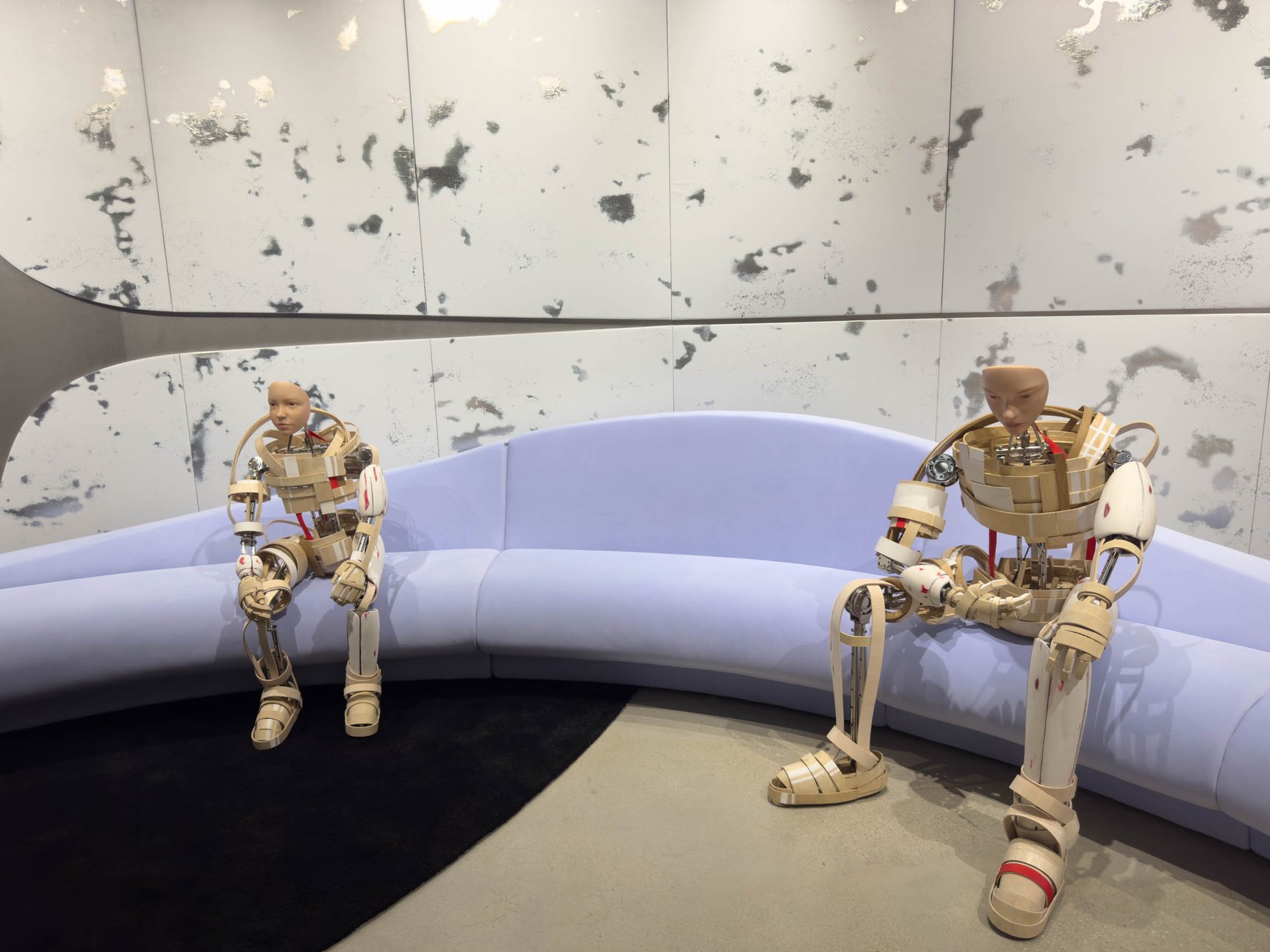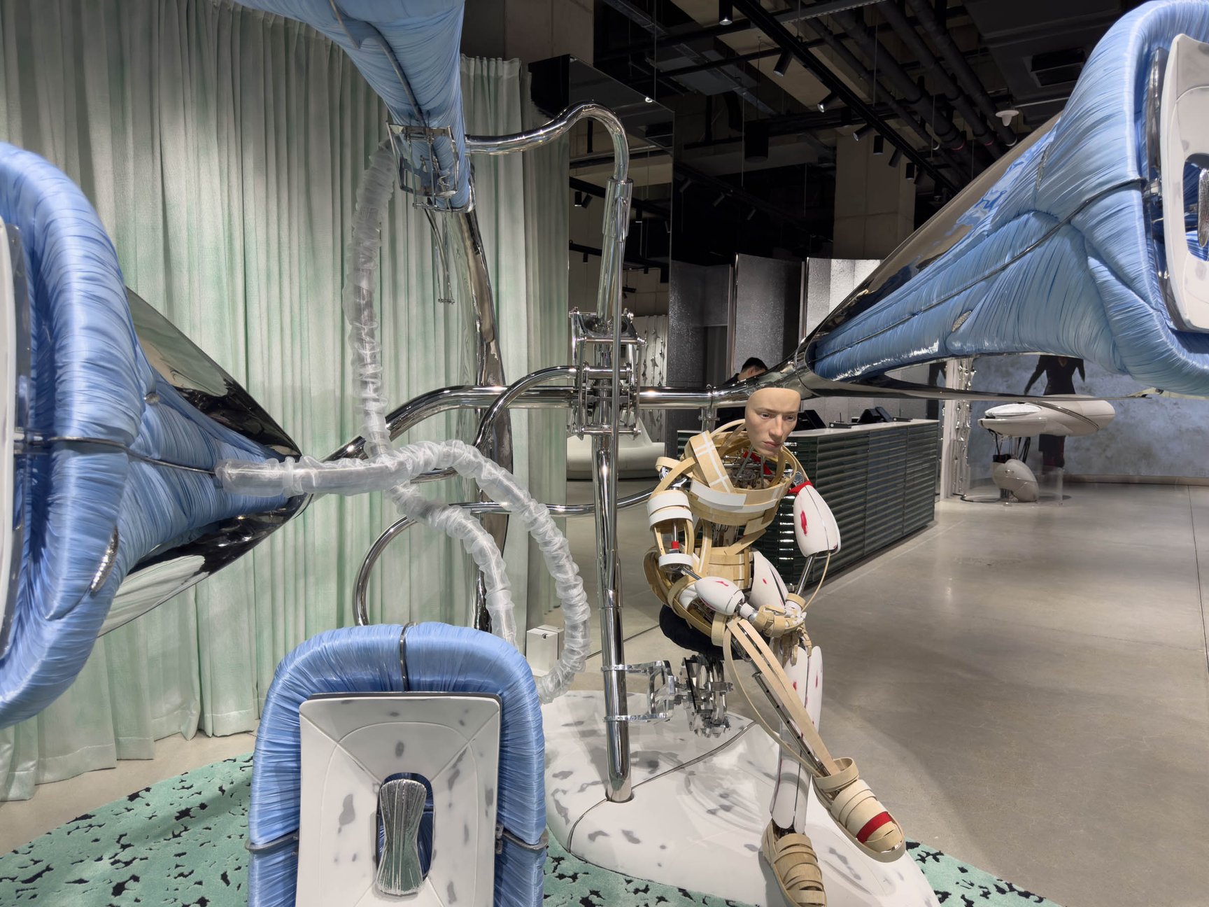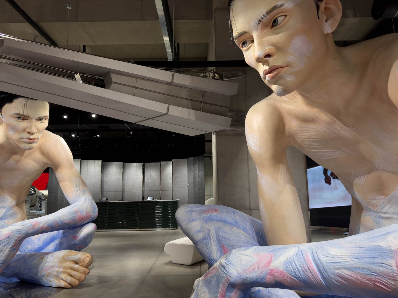 2階はジェントルモンスターの常設ショップに。フロア中央では「未来からやってきた遺跡」をイメージしたというコンクリートのロボットが動き続けており、今年8月に東京・銀座にオープンした「GENTLE MONSTER 銀座フラッグシップストア」と同様の巨人のオブジェも登場。機械的な空間の中で人間の温もりや柔らかさを感じさせる役割を担う。