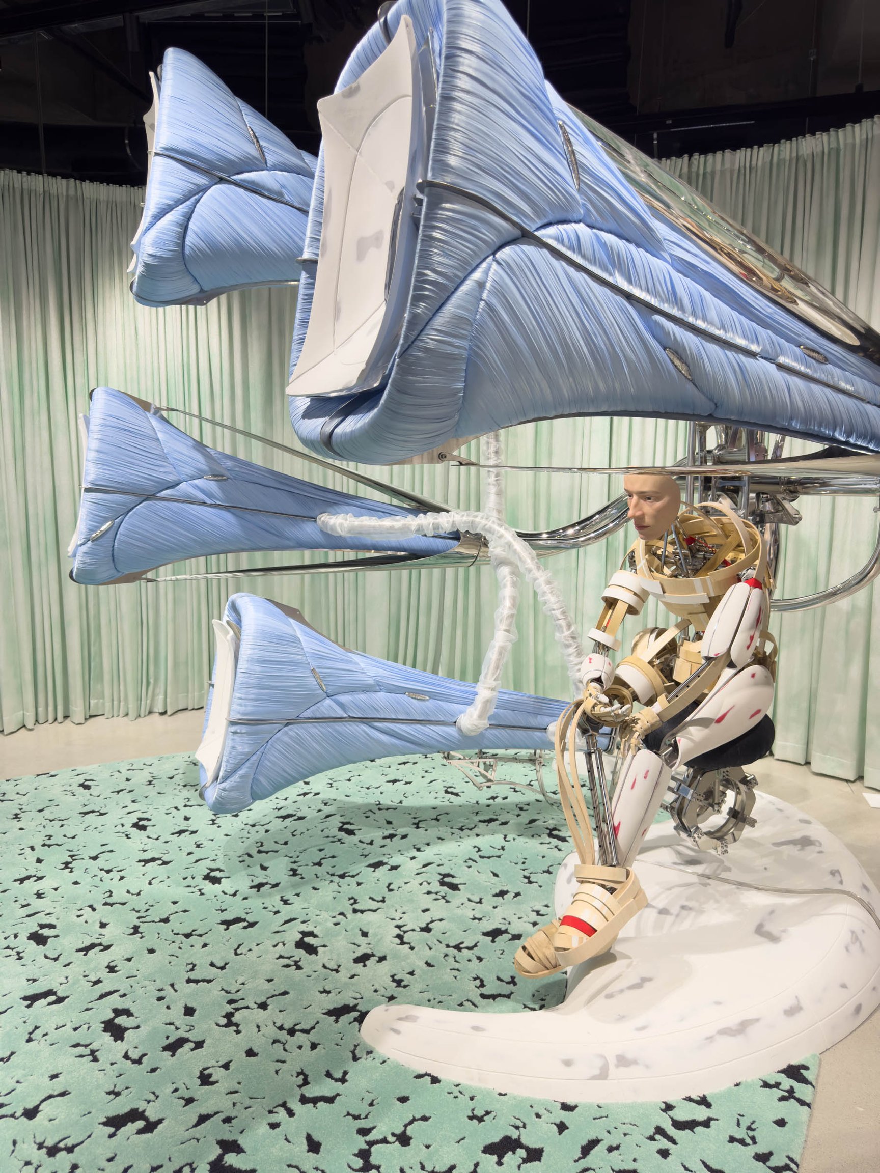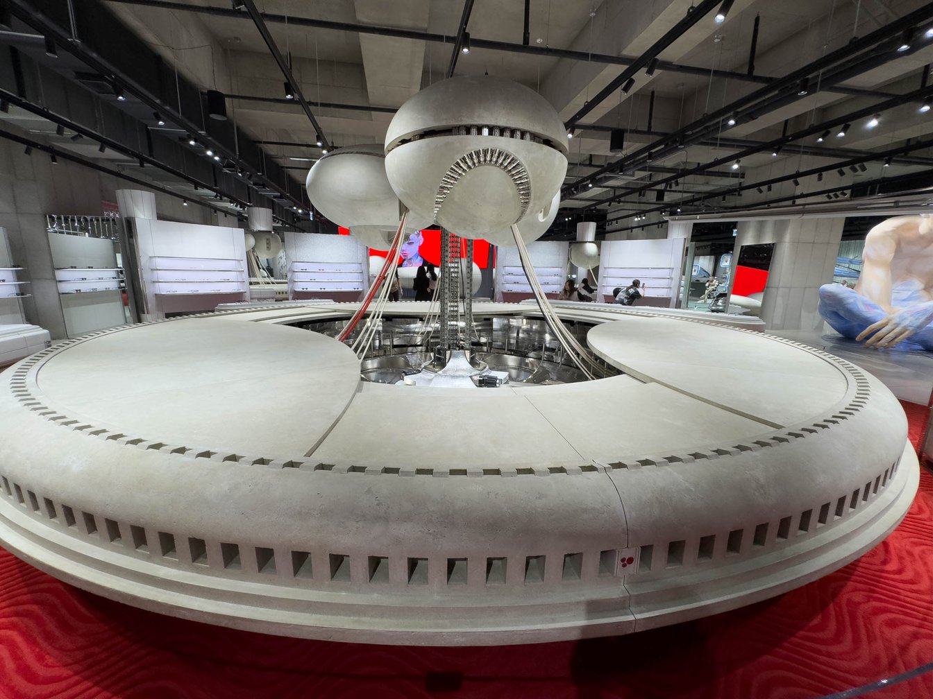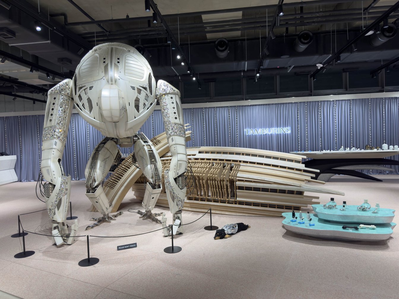 2階はジェントルモンスターの常設ショップに。フロア中央では「未来からやってきた遺跡」をイメージしたというコンクリートのロボットが動き続けており、今年8月に東京・銀座にオープンした「GENTLE MONSTER 銀座フラッグシップストア」と同様の巨人のオブジェも登場。機械的な空間の中で人間の温もりや柔らかさを感じさせる役割を担う。