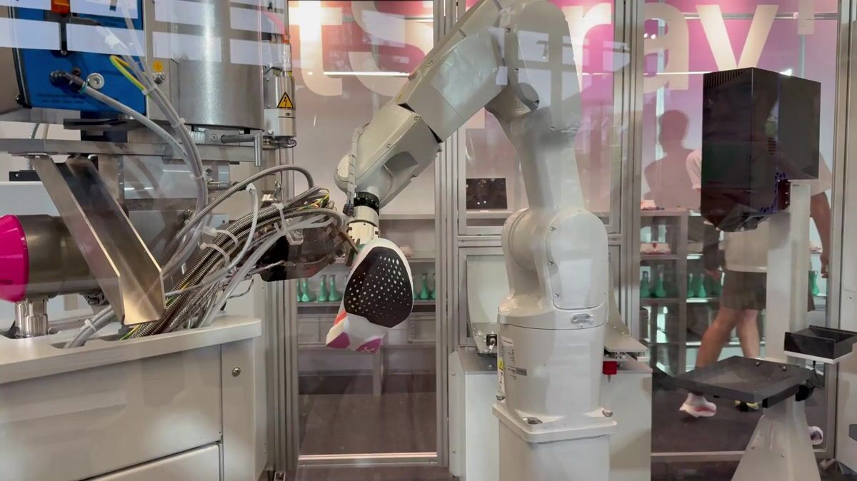 1階の展示スペースでは、オンの最新技術「ライトスプレー(LightSpray)」を実演。ライトスプレーは、ロボットが特殊なフィラメントをミッドソールに噴射し、螺旋状に繰り返すことでアッパーを製造する技術で、これまで複数工程を要していたアッパーの製造を単一工程に短縮。製造時間も大幅に短縮し、片足につき約3分で完成する仕組みだ。