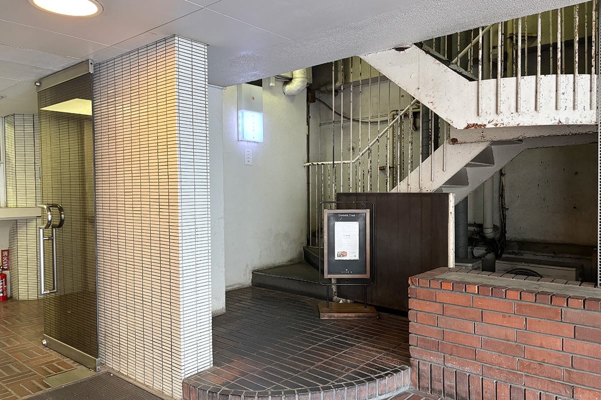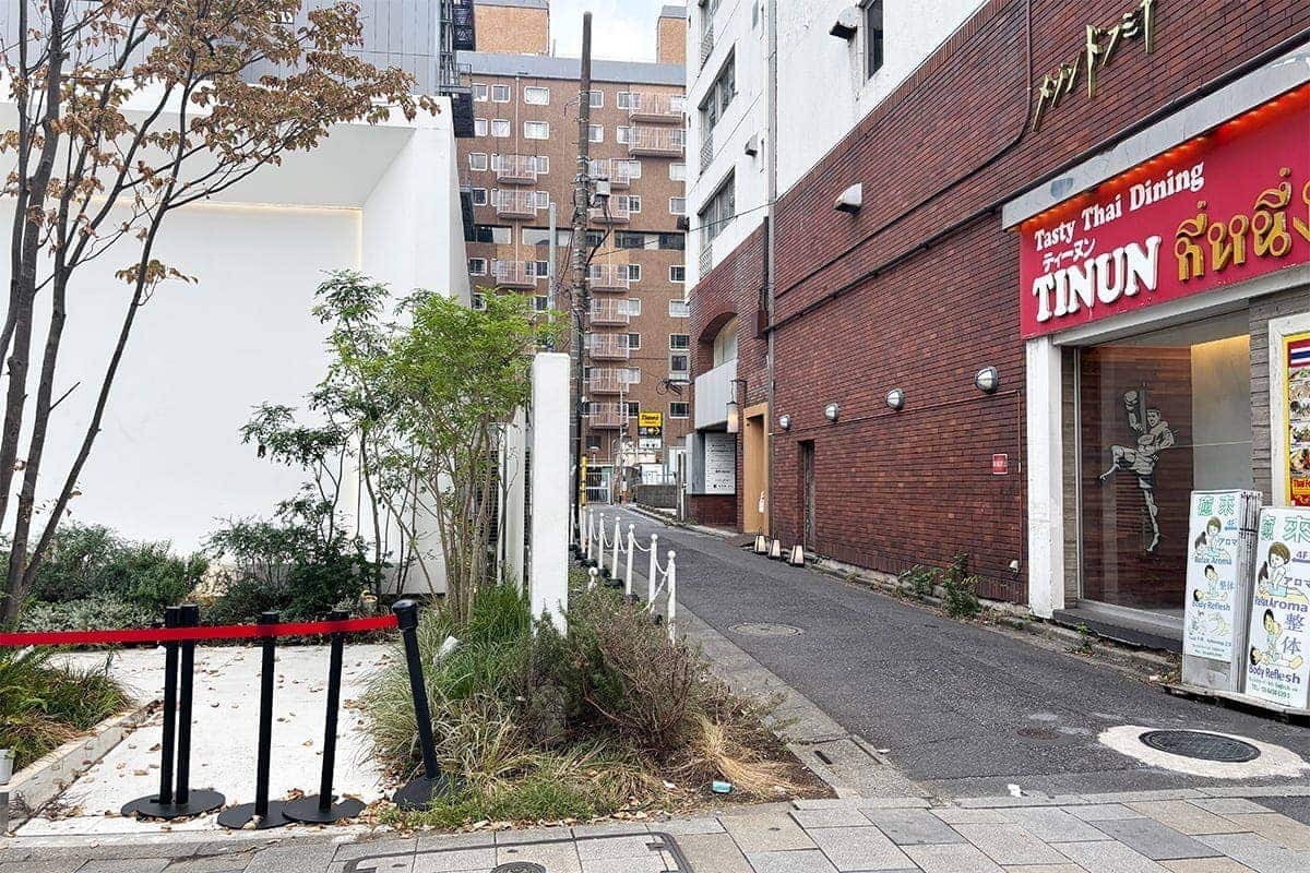 表参道交差点角地にあるイベントスペース「OMOTESANDO CROSSING PARK」の隣、脇道を進んでいくと、右手にビルのエントランスが見えてくる。