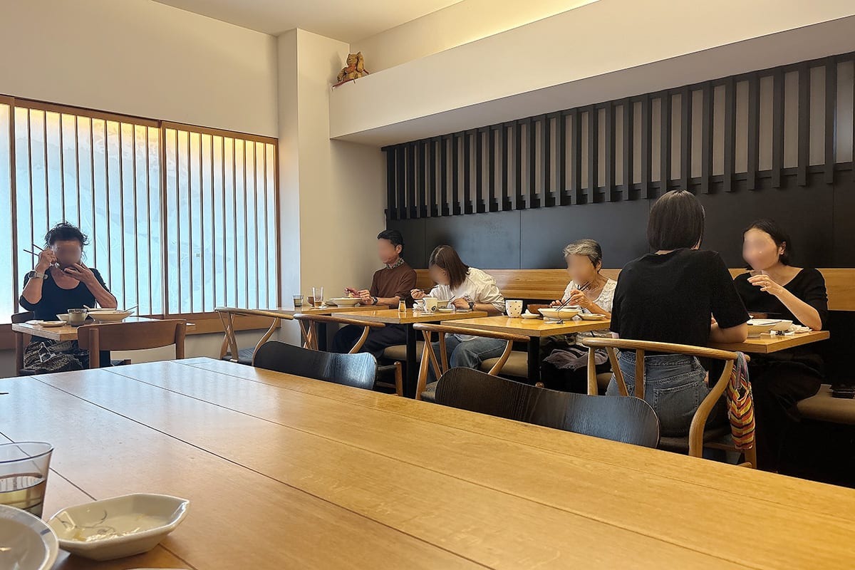 店内は真ん中に大きなテーブルがあり、その周りを2名掛けテーブル席がぐるっと囲む。窓側の障子には世界地図がうっすら浮き出ていて、和モダンながら洗練された気品の高い空間。「身体に優しい中華」をコンセプトにしている希須林は、女性のお客さんが多い印象。若い方から年配のおひとりさままで青山らしいおしとやかで、上品な空気が漂っていた。