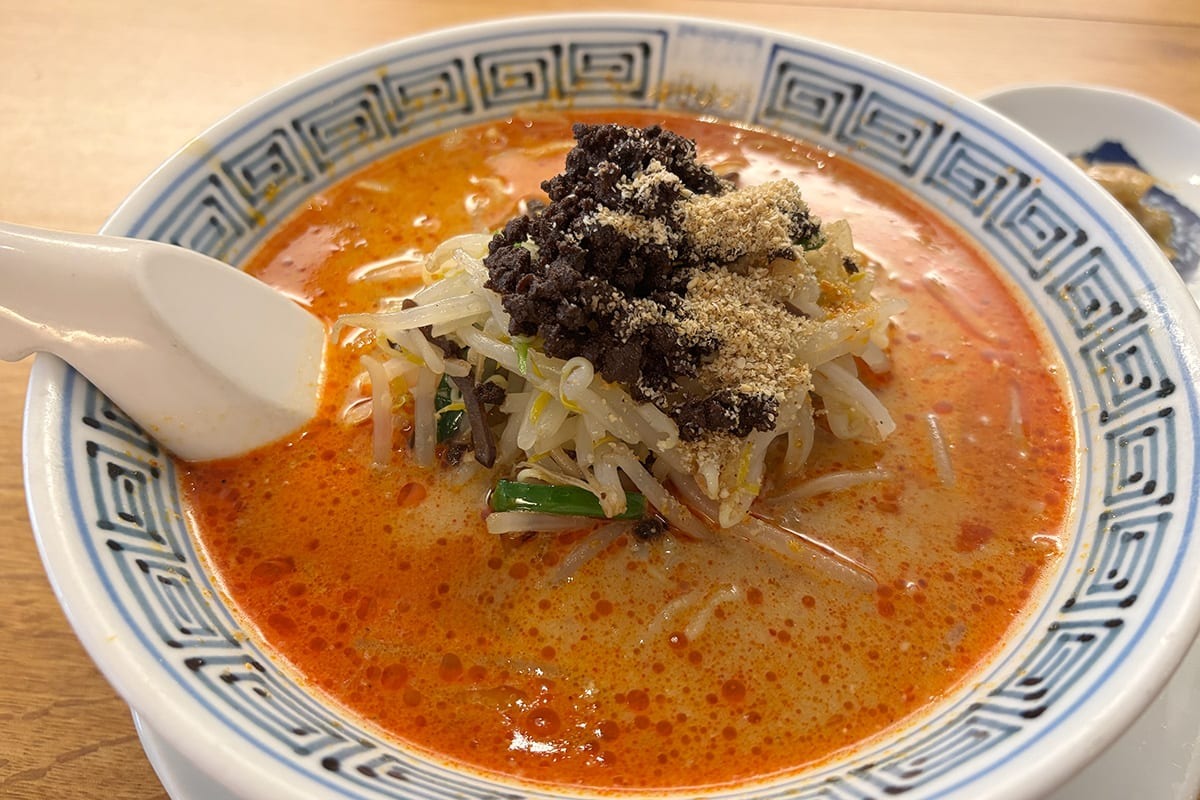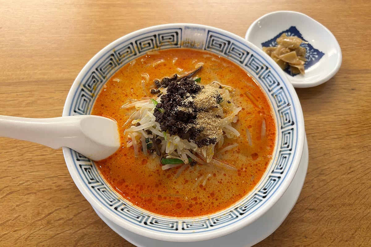 麺の上に乗っていた、粉末状のごまがアクセントになっていて、坦々麺全体にごまの風味が香ってくるのと、スープと麺をコーティングして味のクオリティを一段階上げている。