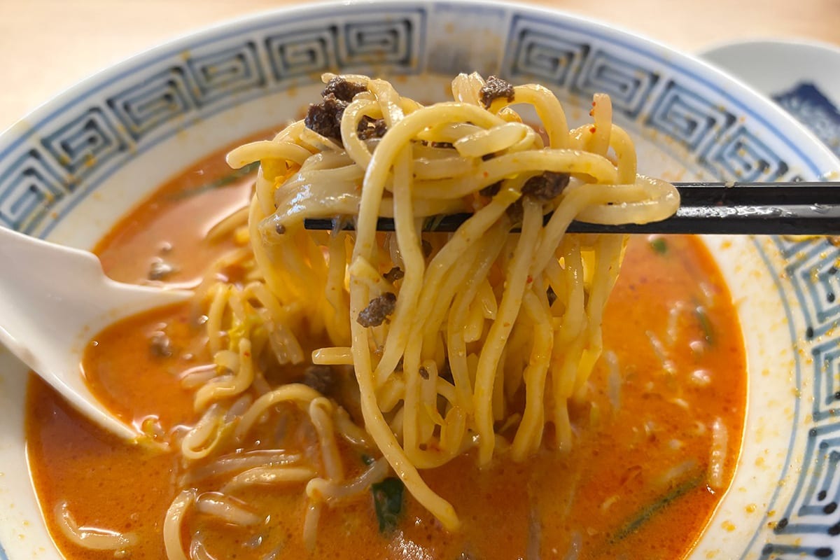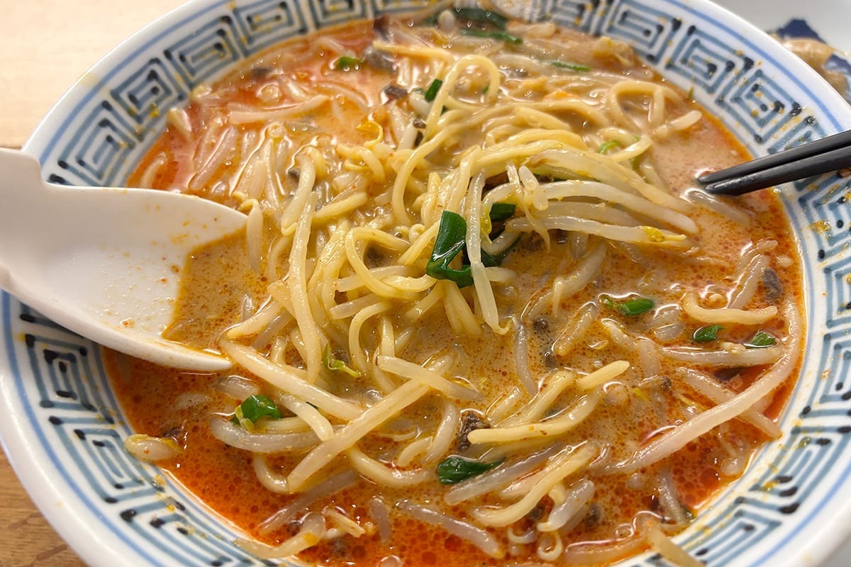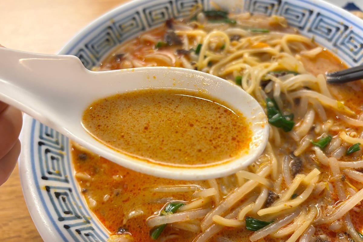 具材をかき混ぜて、早速いただきます。肉味噌スープのコクが深くてめちゃくちゃおいしい。辛さ加減も絶妙で、後からピリリとくるのが食欲をそそり、早く2口目をすすりたくなる!