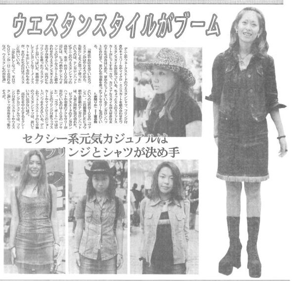 「雑誌やお店を見ていたらウェスタンがはやりそうだから、先取りしようと思って買った」というのは、テンガロンハットにデニムのウェスタンシャツの高校生。東京・渋谷109の周辺には、ヒョウ柄やサンドウォッシュのデニムスカートと組み合わせたウェスタンスタイルの女の子が増えている。店内にもフリンジを使ったウェスタンアイテムがいっぱいだ。新商品としてエレガントなマーメイドスカートを出している店もあるが、女の子たちの目はウェスタンに向いている。