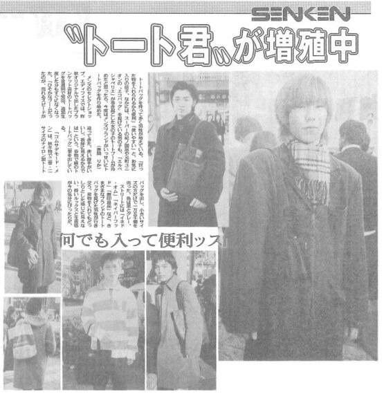 トートバッグを持って歩く男性が増えている。「買った物を入れられるから便利」「使いやすい」と、お気に入りの様子。なかには、スーパーの紀ノ国屋や元町ユニオンの〝エコバッグ〟を提げている男の子も。「エルベシャプリエ」が巻き起こした女の子のトートブームが冷めたと思ったら、今度はメンズブランドがいっせいにトートバッグを作り始めた。
