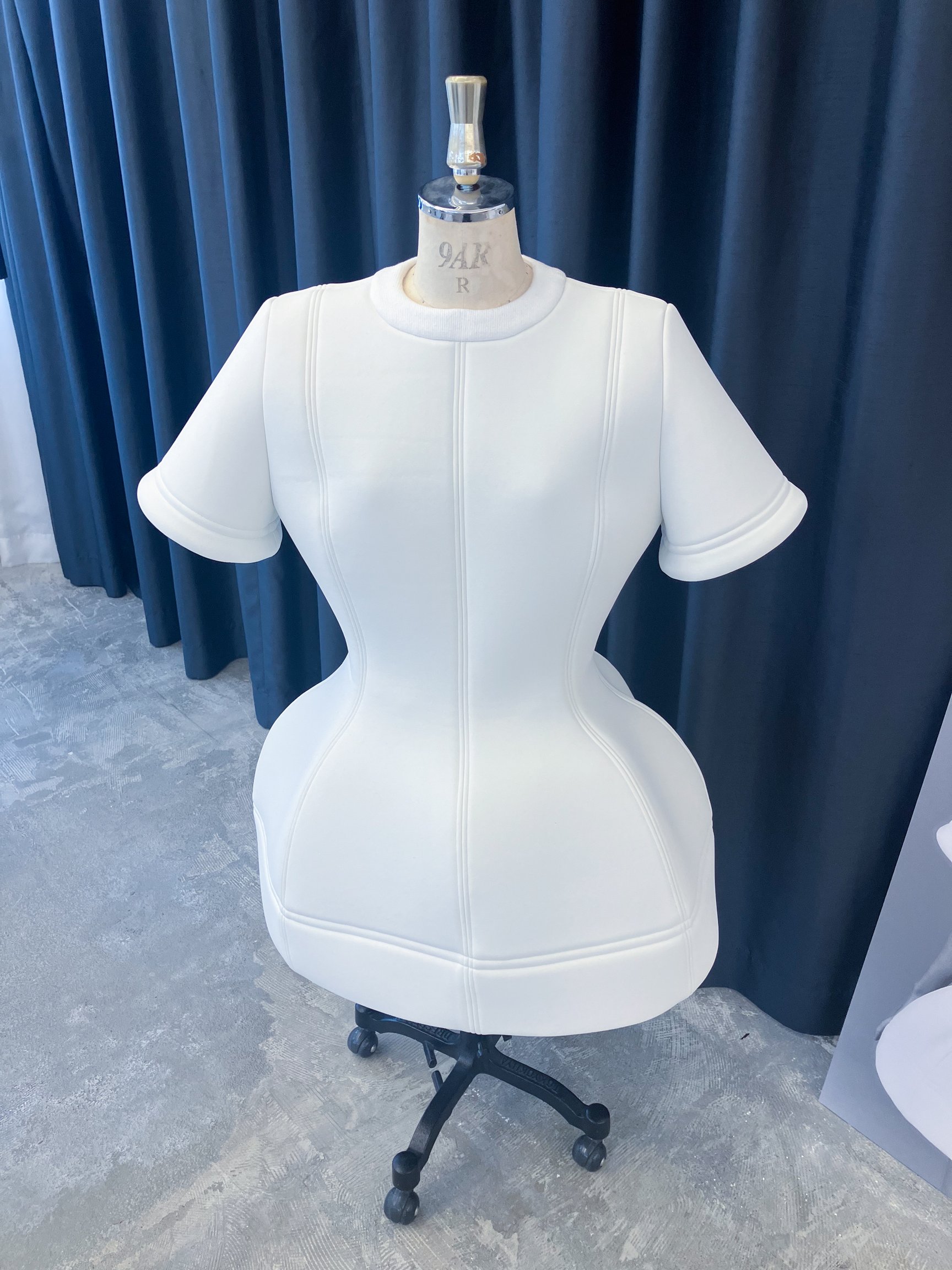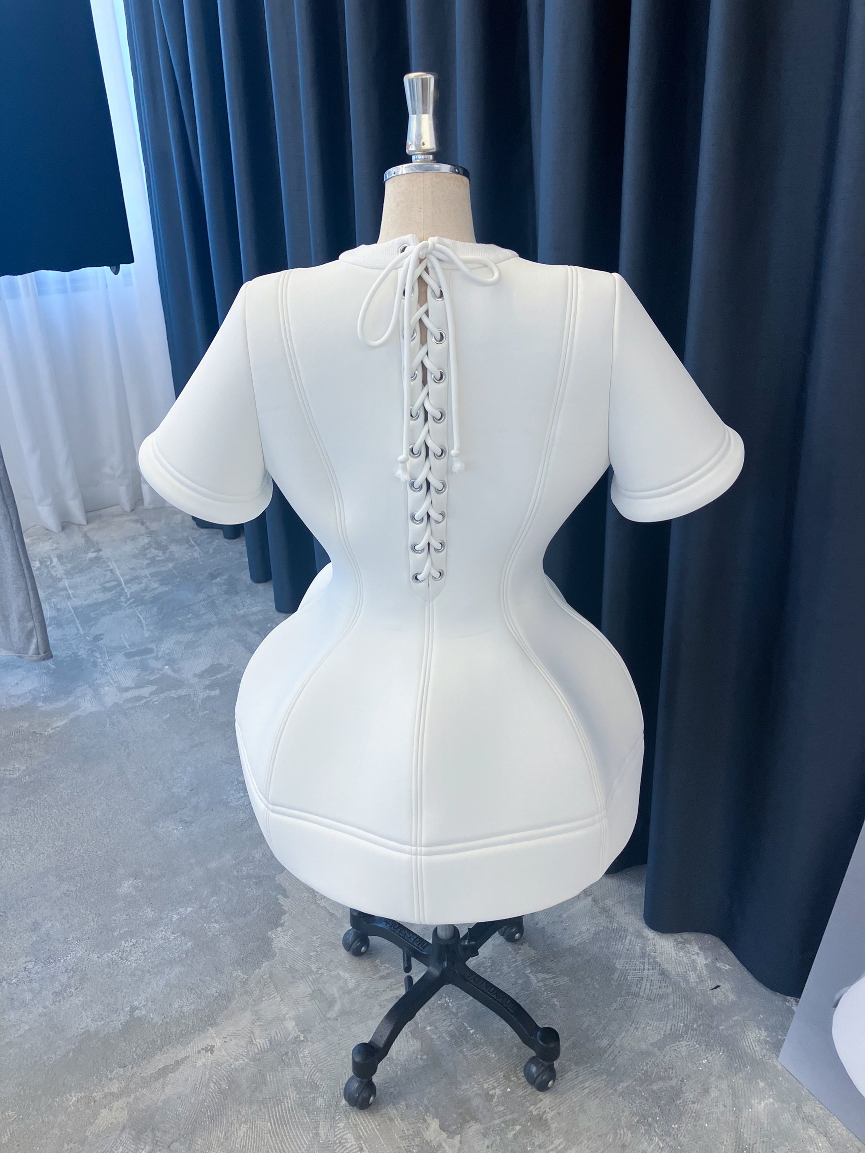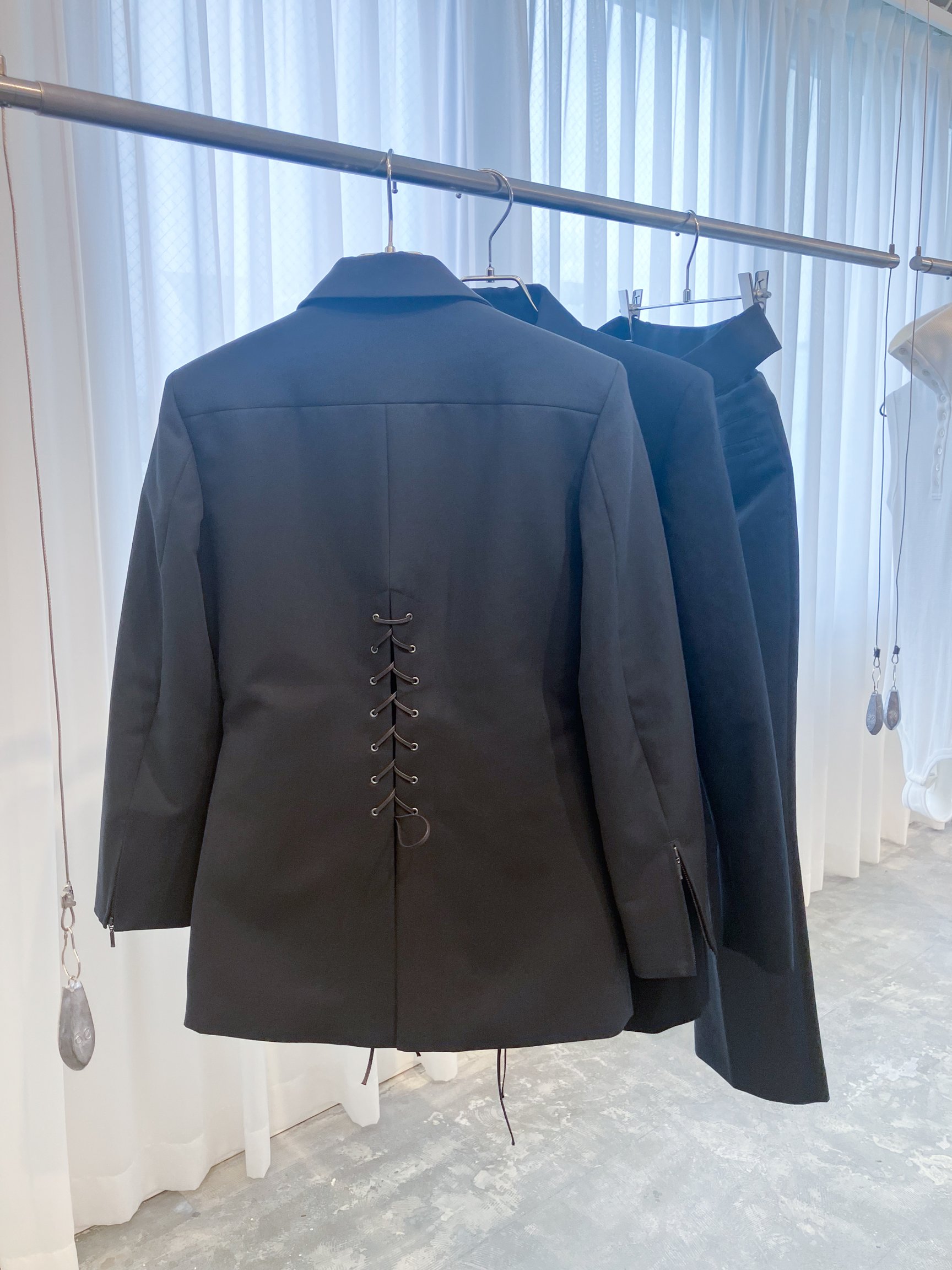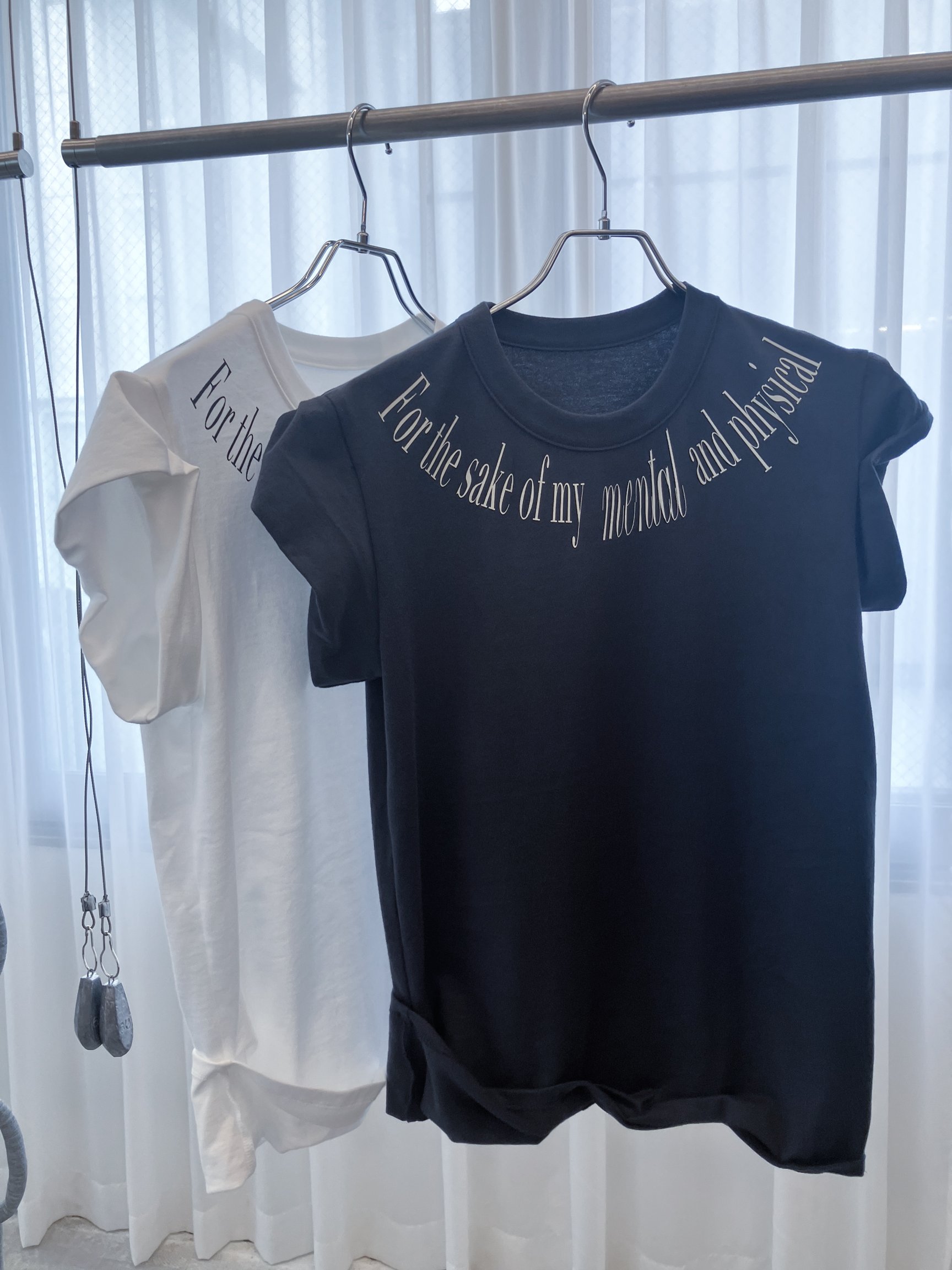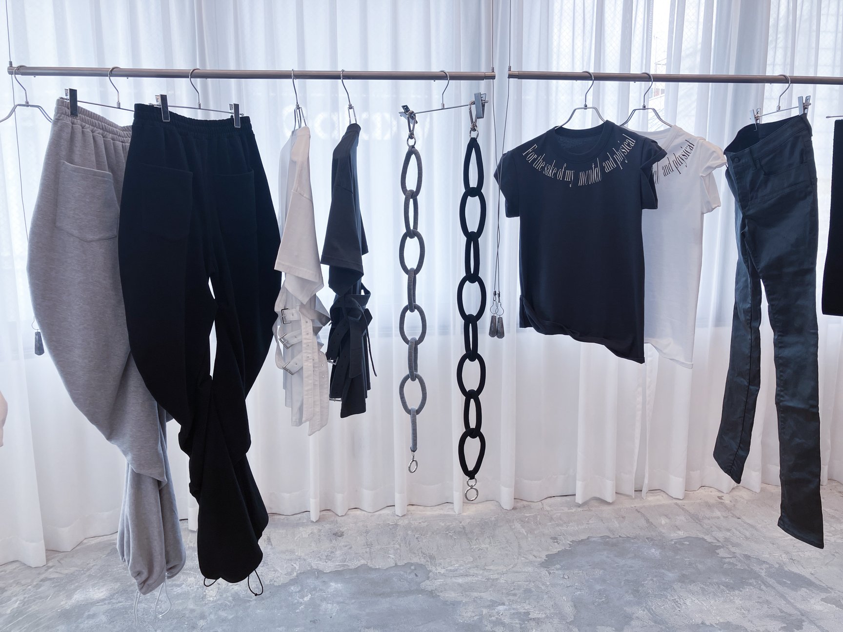 コレクションでは、今季のステートメントピースとして、ボンディング素材のTシャツの背面に編み上げをあしらうことで、コルセットによる身体矯正を思わせるフォルムに仕上げたミニドレスが登場。そのほか、緊張感のある直線的でタイトなシルエットと背面の編み上げディテールが特徴のジャケットや、ゆったりとしたボディに3連ベルトパーツを重ねたTシャツ、「心と体の健康のために、私は自分自身に素直に誠実に生きていく(For the sake of my mental and physical well being, I choose to liive honestly and true to myself)」というメッセージをプリントし、まくれたデザインの袖や裾で「完全体ではない姿の愛おしさ」を表現したTシャツなどをラインナップする。