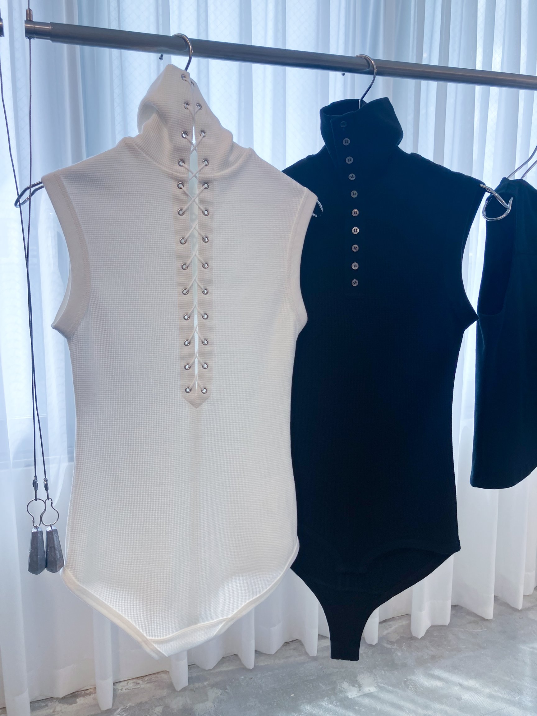 また、2025年春夏シーズンに展開し即完売・再生産した「Piercing tops(T-shirts)」の新作も登場。今季はウエスト部分にあしらったボディピアスの装飾はそのままに、スクエアネックのノースリーブタンクトップにアップデートした。ホワイトとブラックの2色展開で、価格は1万9800円。