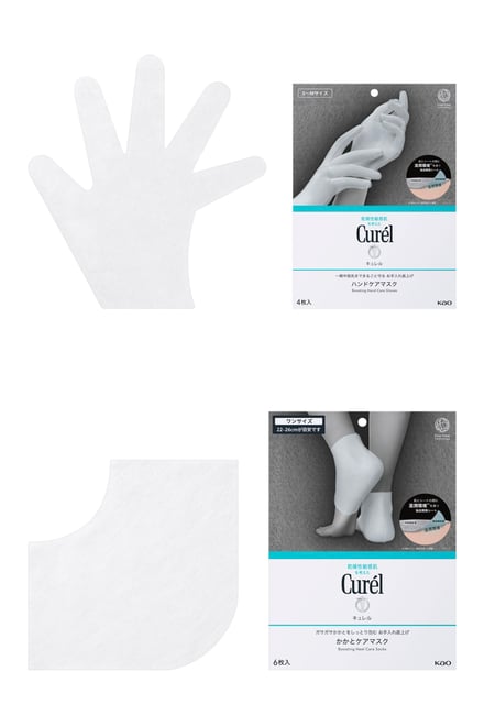 2製品は、蒸れにくく、摩擦の少ない独自開発の2層構造シートを採用したドライタイプのマスク。就寝前に、ガサつきの気になる手またはかかとに保湿クリームなどを塗布し、マスクを着用。内側の極細繊維層が保湿クリームを肌の上にとどめ、肌とシートの間の湿潤環境を保つ。また締め付けることなく優しくフィットし、摩擦刺激や寝具、靴下などへの引っかかりからも保護する。