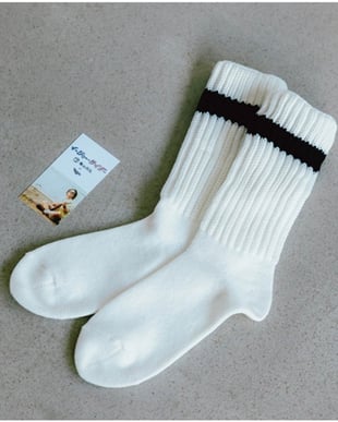 コラボソックスは、ナード マインドが「レザーシューズに本当に合うソックスを作ってほしい」とタビオに依頼し、岩田監修のもと1年以上試行錯誤を繰り返して開発。素材は耐久性に優れたコーデュラ糸を用いて、つま先部分にはリンキング仕様を採用することで縫い目のごろつきを抑えたという。オフホワイトとブラックの2色を展開し、価格は各2970円。