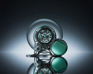 アイテムは、水の透明性や有機的なフォルムからインスピレーションを得て製作。古代の工芸品を現代のオブジェクトとして再構築するダニエル・アーシャムの考古学的ヴィジョンと、ウブロの異なる素材やアイデアの融合を図る「アート・オブ・フュージョン」の視点を掛け合わせた。本体に、より小型化した手巻きムーブメント「メカ10」を搭載することで、ケースサイズを42mmとコンパクトに設計。流れる水をモチーフに、文字盤の開口部に水しぶきを模した形をデザインしたほか、ケースバックにはサファイアクリスタルを採用した。時針や分針をはじめとする各所には“アーシャムグリーン”を配している。価格は904万2000円。