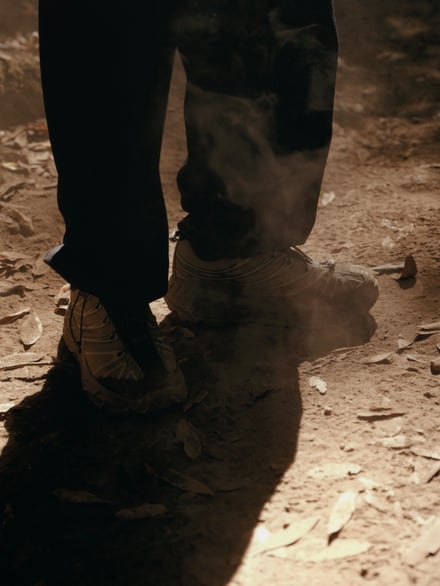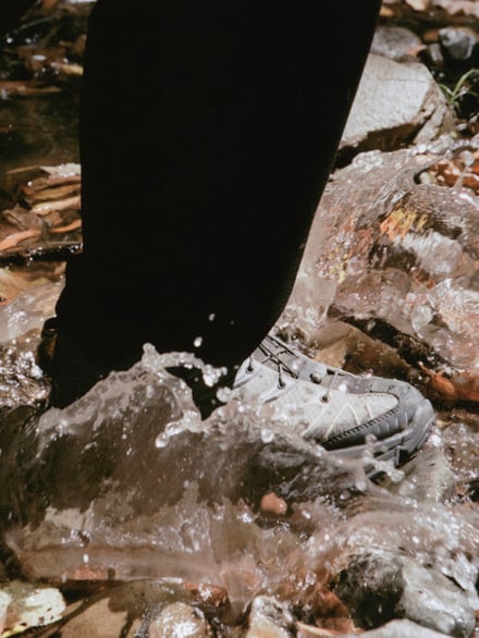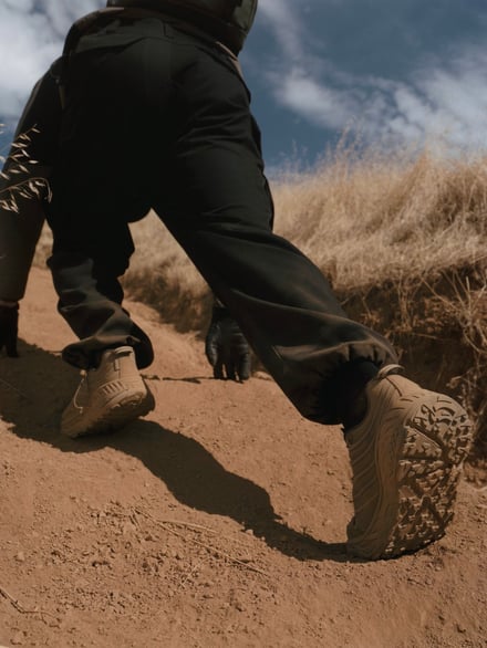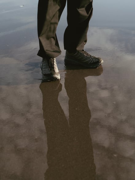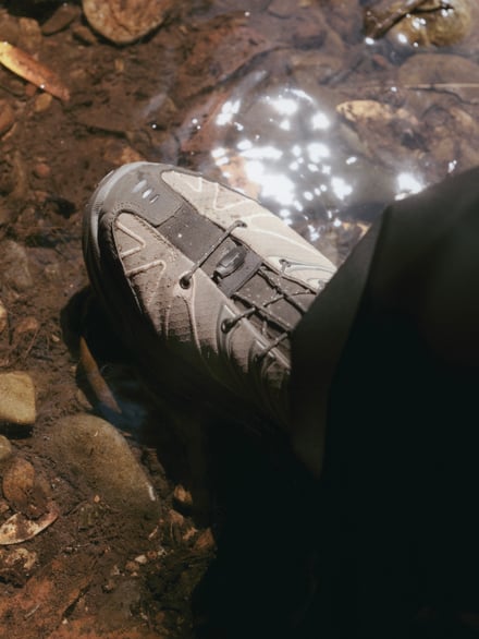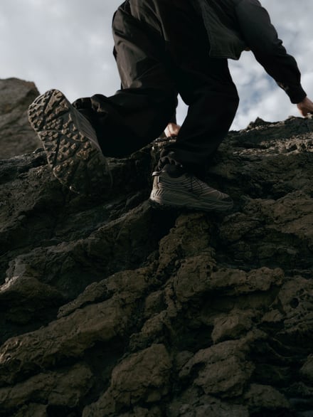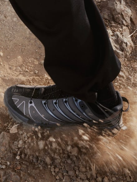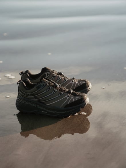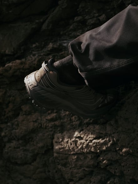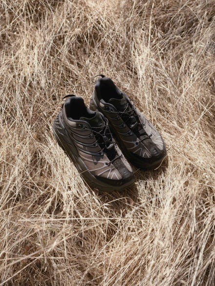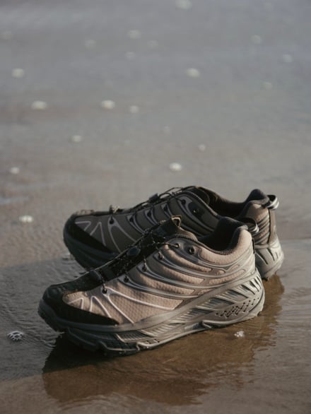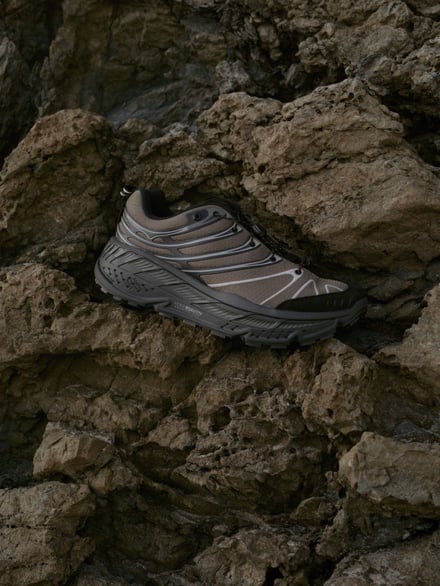 コラボシューズは、ホカのアーカイヴから「Stinson EVO OG」をベースに採用した。GORE-TEX®を搭載し、アッパーには西海岸の岩石層をイメージした「ターマック」を使用したオリジナルテキスタイルを用いた。ミッドソールには、ホカの特徴的な厚底クッションとロッカー形状、アウトソールには凹凸のあるラバー素材を配置し、あらゆる天候や路面での快適性と耐久性を実現したという。