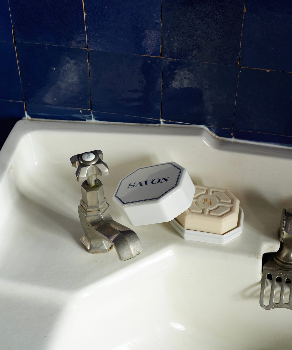 ポルト・サヴォンは、シンプルで飽きのこないエナメル仕上げの陶器製ソープホルダーで、伝統的に陶器生産が盛んなポルトガルで製作した。ビュリーの中性せっけん「サヴォン・スゥペールファン」(5170円)のためにデザインし、青と白の無垢な色合いや、快適な使い心地をキープする穴の空いた受け皿と蓋の衛生的な構造が特徴だ。サヴォン・スゥペールファンの、洗練された香りやフランス式庭園を思わせる美しいフォルムを損なうことなく、バスタブや洗面台の一角に華やかさを添える。