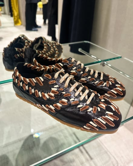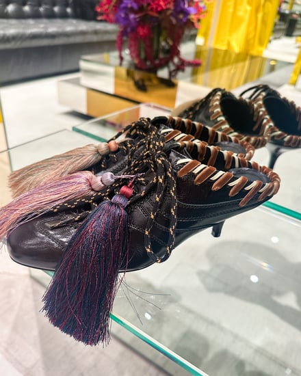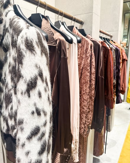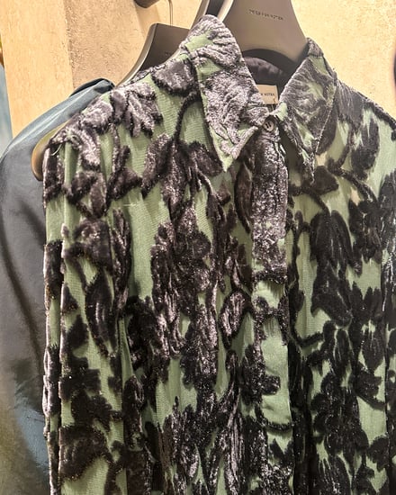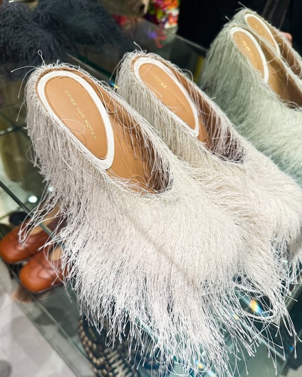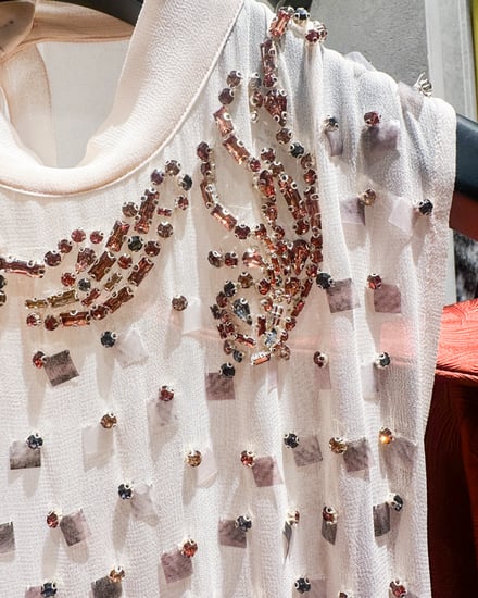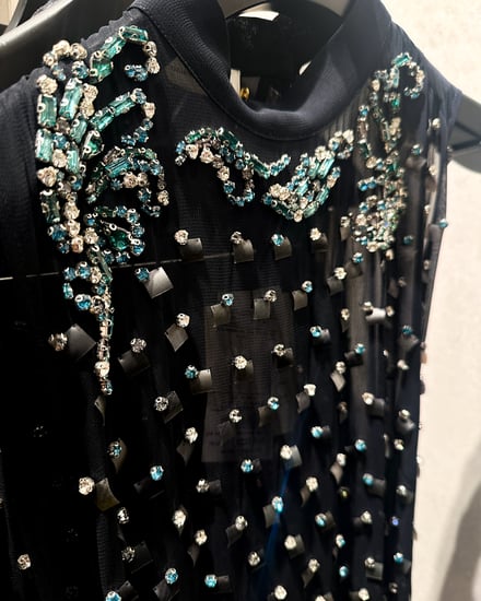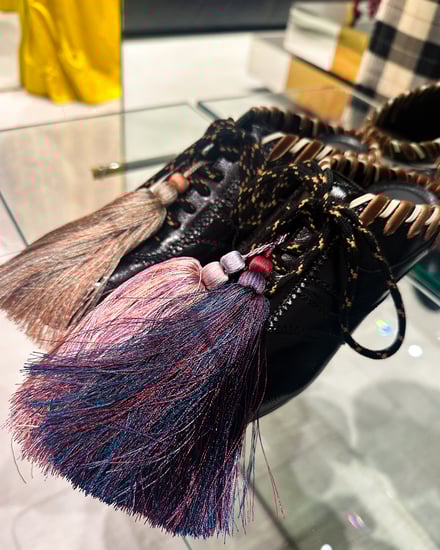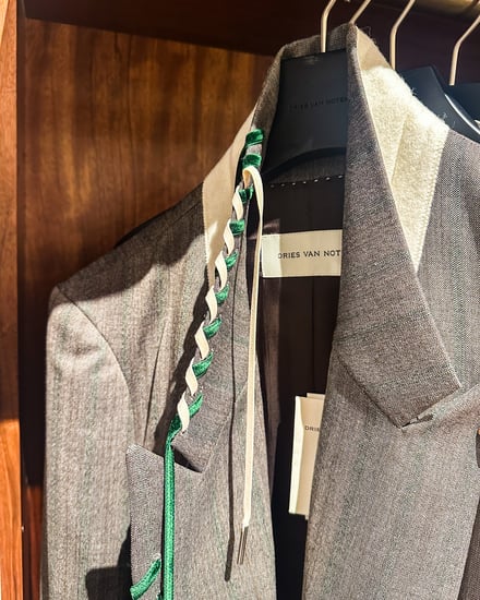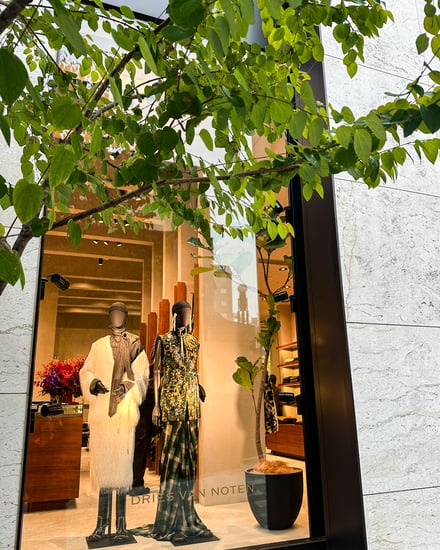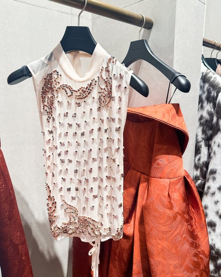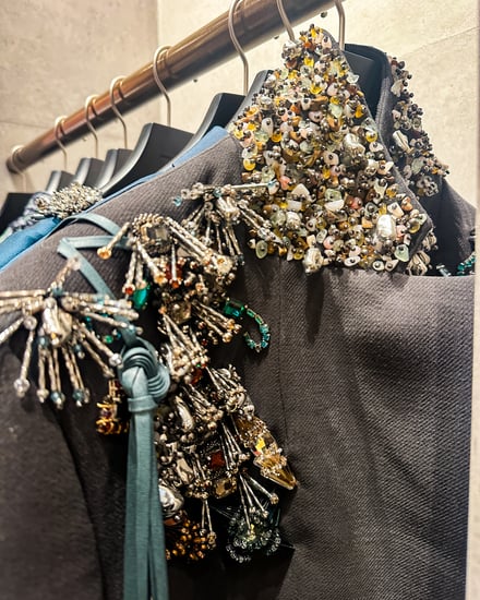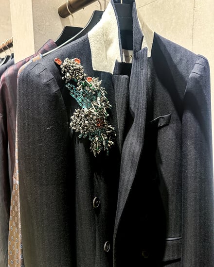 青山店では現在、デビューシーズンの2025年秋冬コレクションを展開中。ドリスらしい花々の彩りをグラフィカルに表現したテキスタイルや、ビーズの装飾、柔らかで繊細なフリンジといった細部への美学を継承しながら、クラシカルかつタイムレスなスタイルが際立つ。ファーストルックを飾ったコートで特徴的だったステッチディテールをあしらったジャケットやシューズ、スパンコールとビーズを一つずつ縫い付けたブラウス、無数のビーズをブローチのように立体的にあしらったジャケットなど、豊富なラインナップを展開している。
